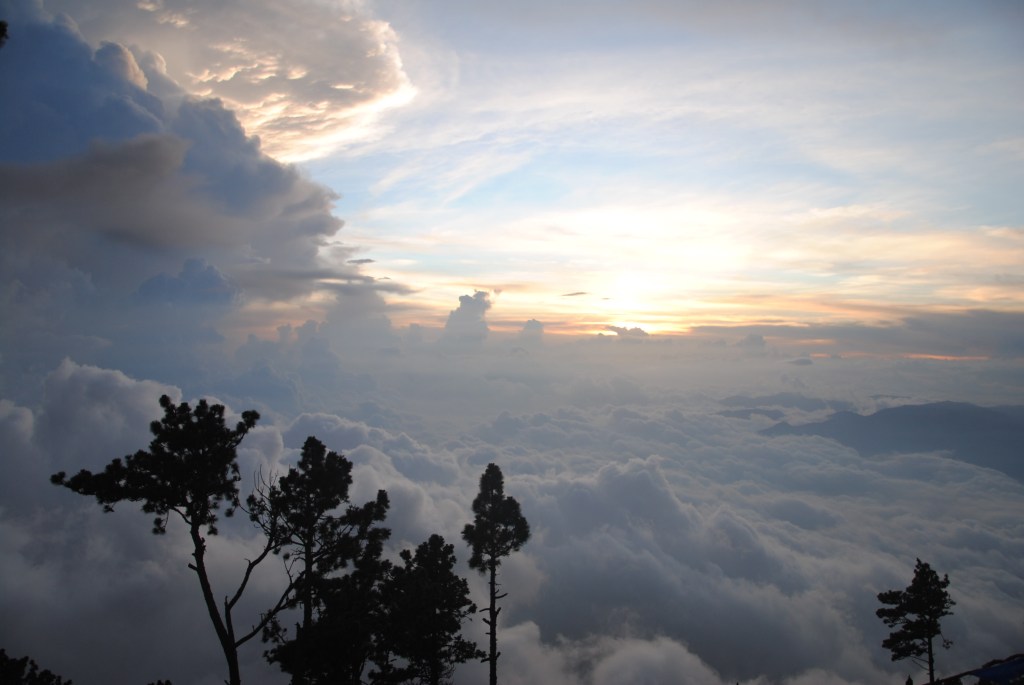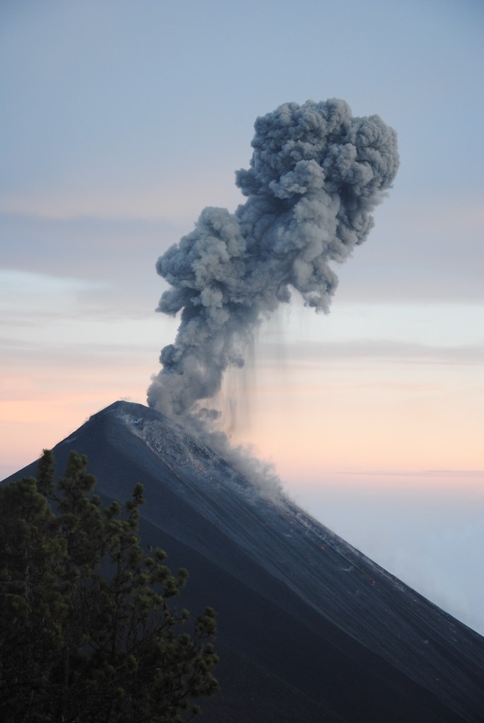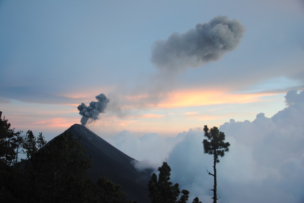 Fatigué par la marche, l’attente (surtout), et les émotions intenses, je m’assoupi un moment. À mon réveil, le Fuego éternue toujours, mais sur fond orange-rosé de fin du jour. Le panorama tout entier est si exceptionnel qu’il nous tirerait presque une larme. À la droite du volcan, d’épais nuages blancs ont formé une immense montagne de coton, dont le soleil couchant teinte le sommet d’ocre. Au pied de la montagne, la mer de nuage couvre toute la vallée, quelques crêtes seulement émergent comme autant d’îlots. Au fond, des orages éclatent, les éclairs percent bruyamment l’horizon. C’est si beau. Nouveau coup d’œil sur le Fuego, dont les contours se dessinent désormais en violet. Le spectacle est accablant de beauté, et l’émotion gagne les marcheurs, silencieux devant ce miracle de la nature.