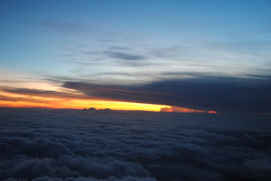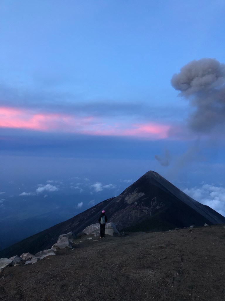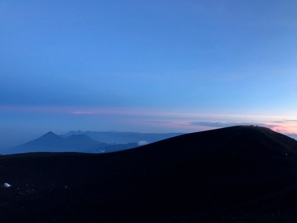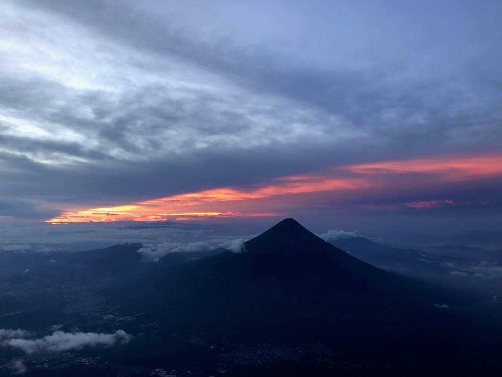 Dimanche matin, sur les pentes de l’Acatenango. 4h, Rufino sonne le clairon. La nuit n’a pas été blanche, mais rouge et noire, tant je me suis réveillé à chaque éruption pour contempler le spectacle de mes yeux gonflés. Arlette a quant à elle passé une mauvaise nuit. Déjà enrhumée en raison des conditions précaires de voyages dans les chicken bus, elle a souffert du froid dans son mauvais sac de couchage. Mais, stoïque, elle se lève sans se plaindre. Les cheerleaders ont elles aussi mal dormi, leur tente n’étant équipée ni du chauffage, ni du double vitrage. Nos amis américains tiennent un sourire endormi sur le visage, prêts pour l’ascension. Rufino mène la danse, et, torches en main, nous nous engageons dans l’obscurité, faiblement éclairés par El Fuego qui continue à gronder. Dès les premiers mètres, nos princesses de l’extrême sont au bord de l’agonie. Alonia annonce théâtralement souffrir du mal des montagnes et être au bord de la nausée. Sur un ton dramatique, elle nous invite à continuer sans elles (Lilly, sa dame de compagnie, doit évidement rester avec elle). Rien ne nous ferait plus plaisir que d’abandonner ces boulets à paillettes, mais le froid est saisissant et Rufino ne peut pas se risquer à les voir emporter par l’hypothermie. Arlette bouillonne face au comportement insupportable des jeunes filles, et fini par leur intimer de se reprendre. Rufino en rajoute une couche en leur faisant comprendre qu’il leur faut rester en mouvement, dans un sens où de l’autre. Elles finissent par nous rejoindre, pérorant sur un ton beaucoup trop énergique. Rufino est trop expérimenté pour savoir que Miss America est loin d’être à l’agonie. Nous repartons donc à une allure traînante. À ce train nous allons manquer le lever du soleil…Je suggère à Rufino de nous laisser nous greffer au prochain groupe (nous entendons des voix en contrebas), tandis qu’il s’occupera des enfants à l’arrière. Il valide le plan, et bien vite la troupe arrive. Alors que nous prenons le train, Alonia, visiblement remise, dit : “ah non mais eux ils ont un bon rythme, c’est vous qui allez trop vite !”. S’en est trop pour Arlette, qui grimpe sans rien dire avec le nez bouché et la gorge prise depuis un réveil difficile, et je dois la pousser vers l’amont pour éviter une crise diplomatique. L’arrivée au sommet est l’affaire de quelques minutes et la vue spectaculaire pose un baume bienvenu sur les tensions et la fatigue. Nous marchons vers l’est du cratère, et découvrons une bande orange vif posée sur une mer de nuages mauves.