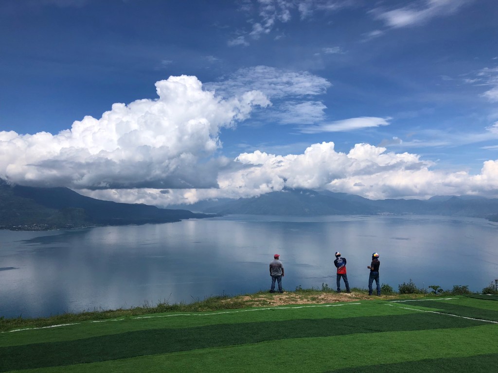 Jeudi matin, Panajachel. Je trépigne en mangeant sans enthousiasme le « desayuno tradicional » compris dans le prix de la chambre. Puis nous marchons à vive allure vers la piste d’atterrissage. Là, avec un couple de Guatémaltèques vivant à Houston, nous grimpons dans un van qui nous emmène à notre point d’envol. Arlette m’attendra sur les bords du lac, elle souhaite rester sur l’impression merveilleuse de son récent vol dans les Dolomites. Pendant que le bus zigzague dans la montagne, je papote avec mes collègues de l’extrême. Le couple, la cinquantaine, est tout excité à l’idée de se jeter au-dessus du lac. Ils filment leur aventure à la manière d’un documentaire. « El Frances » sera au générique. Dans cette ambiance bon enfant, nous débarquons à la zone de décollage, et le staff, discret et professionnel, nous équipe. La vue de notre nid d’aigle est magnifique ! Le lac semble couvert de satin lisse et brillant, et dans le ciel bleu des nuages de ouate blancs caressent le sommet des volcans.