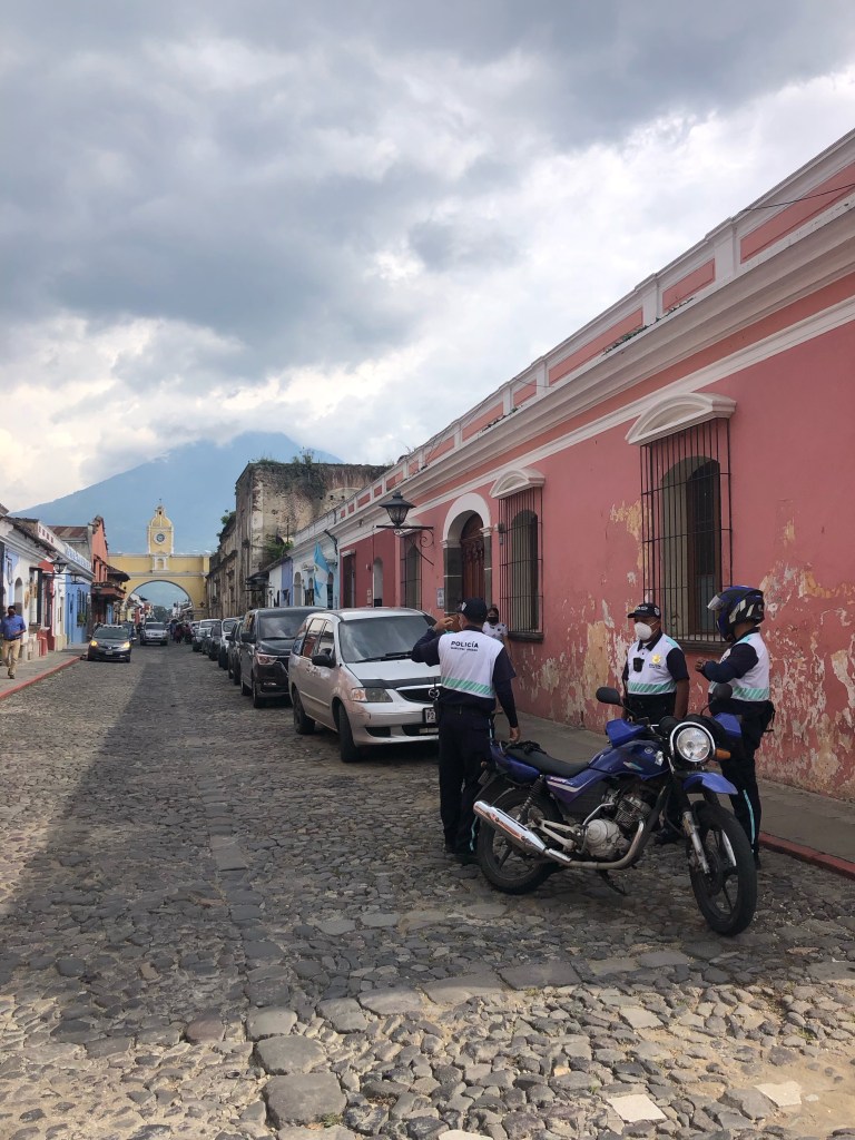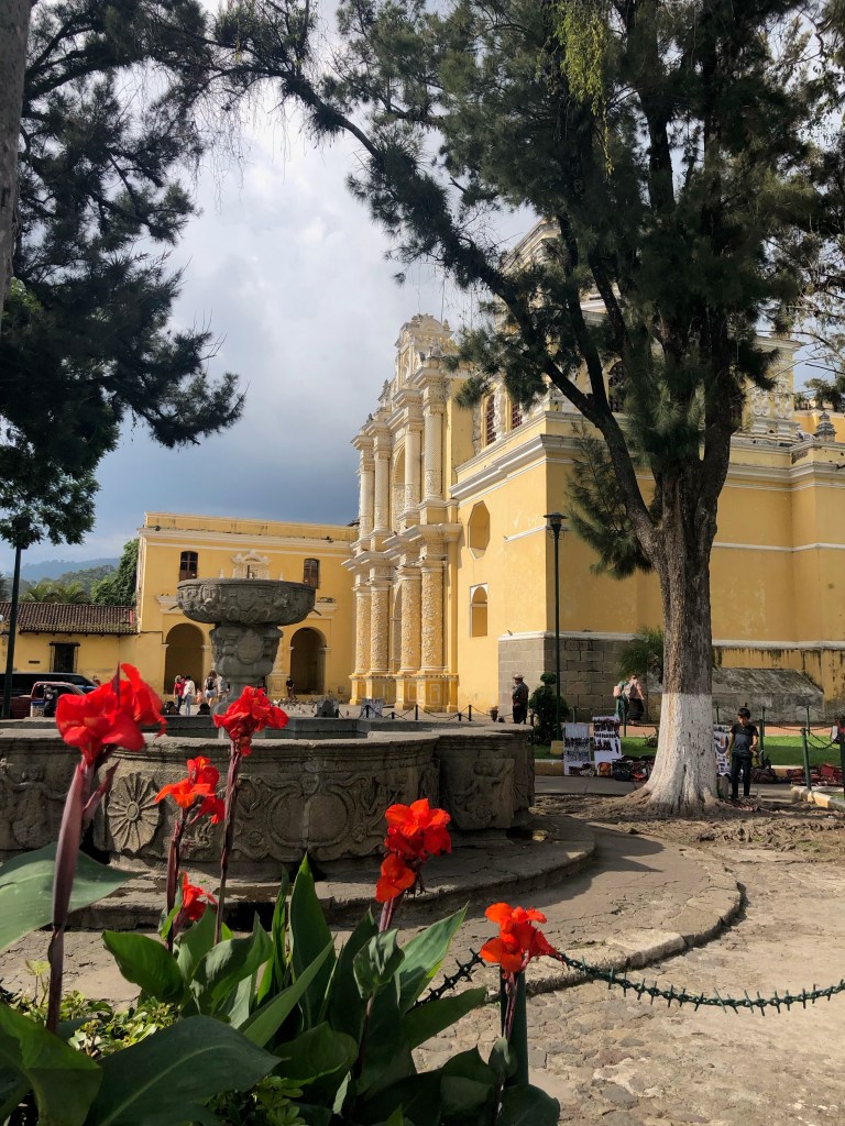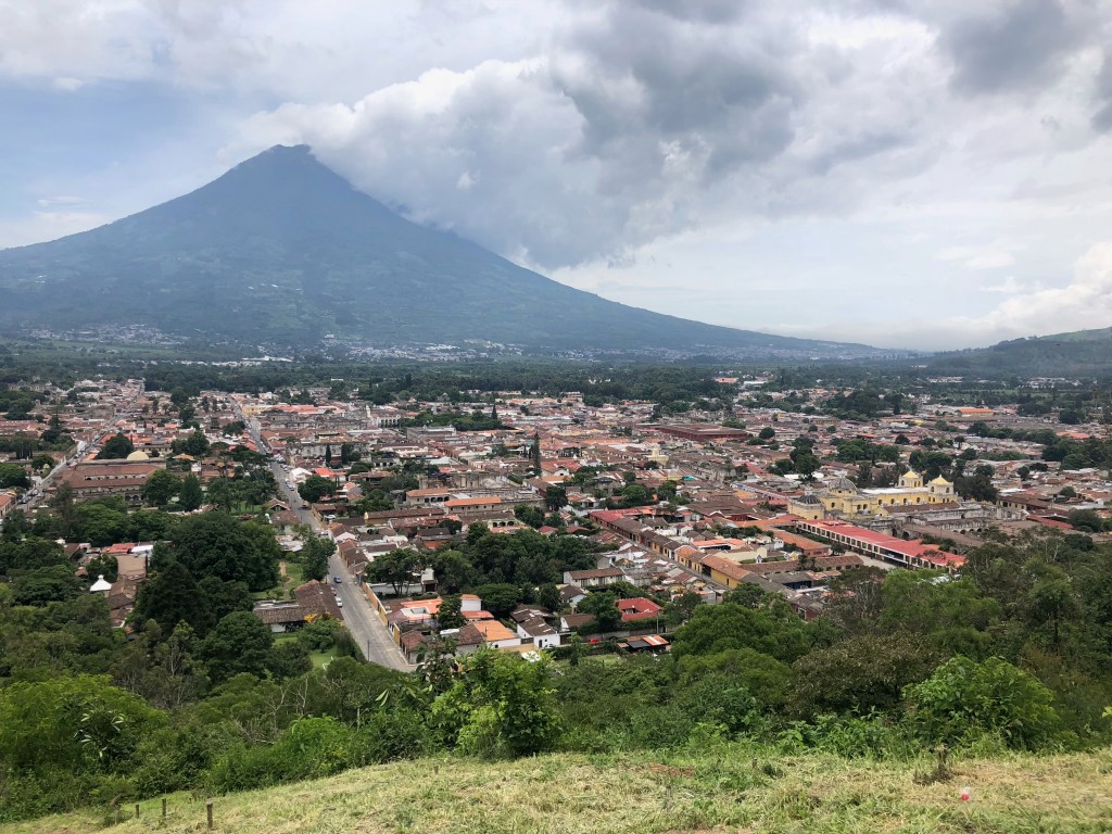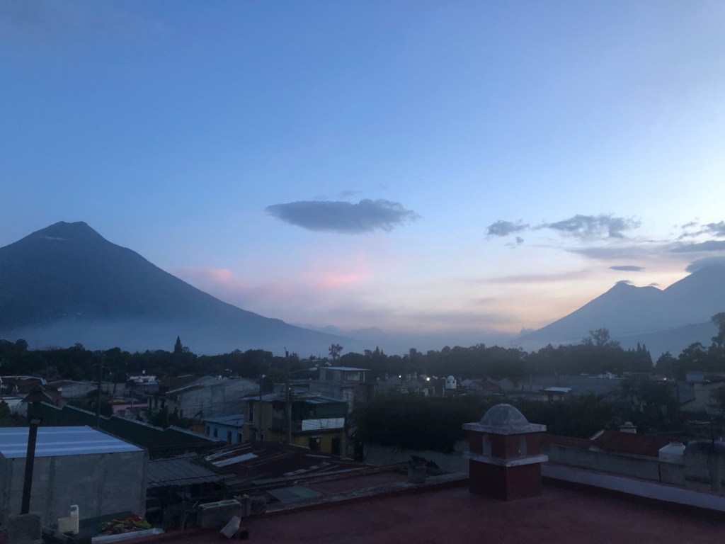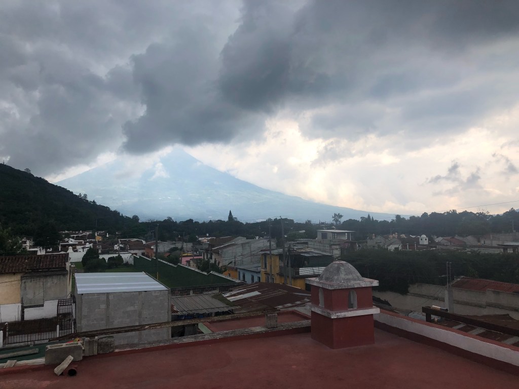 Un peu éloignée du centre, la petite maison jaune est charmante, avec son patio fleuri et son personnel accueillant. Surtout, le toit terrasse dispose d’une vue magnifique sur les trois volcans d’Antigua : l’Agua, conique et imposant, domine la cité de toute sa hauteur ; plus loin à l’ouest, les mythiques Acatenango et Fuego se font face, le premier surveillant les éruptions du second. Pour l’heure, le temps est couvert et nous nous contentons de l’Agua, les deux autres étant perdus dans les nuages.