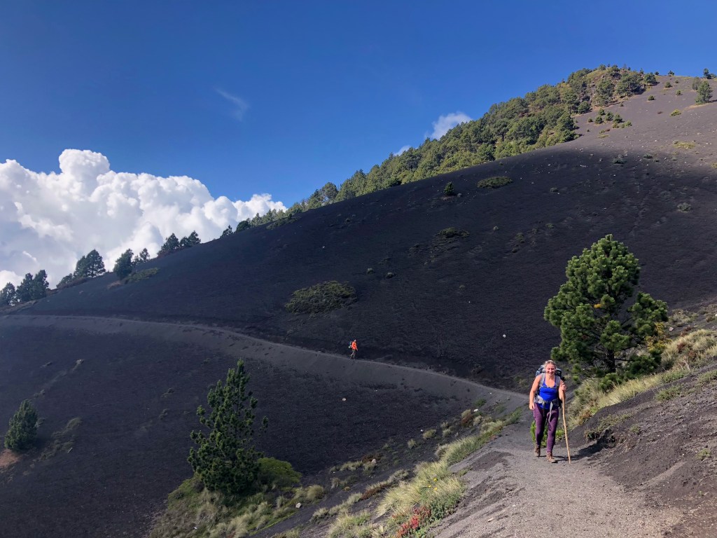 Et puis, la conversation avec Colleen et Patrick est agréable. Elle, sportive et voyageuse invétérée, et lui, ours bienveillant et sosie non-officiel de Ray Donovan, partagent avec nous le goût de la nature et de l’effort. Rufino doit supporter seul les manies des deux randonneuses manucurées, et il le fait avec une irréprochable patience. À notre énième pause, nous le voyons arriver cette fois avec une triplette de bardas, le sien et ceux des deux jeunes filles. « Je crois qu’elles n’ont jamais fait d’exercice de leur vie » nous glisse-t-il dans un sourire. « Elles sont leeeeeeeeentes… ». C’est le moins qu’on puisse dire…Mais nous sommes quasiment arrivés au campement, et c’est bien l’essentiel. L’approche finale est somptueuse. Le sentier continue sur les flancs du cratère, où quelques arbustes, quelques fleurs mêmes poussent au milieu du sable noir.