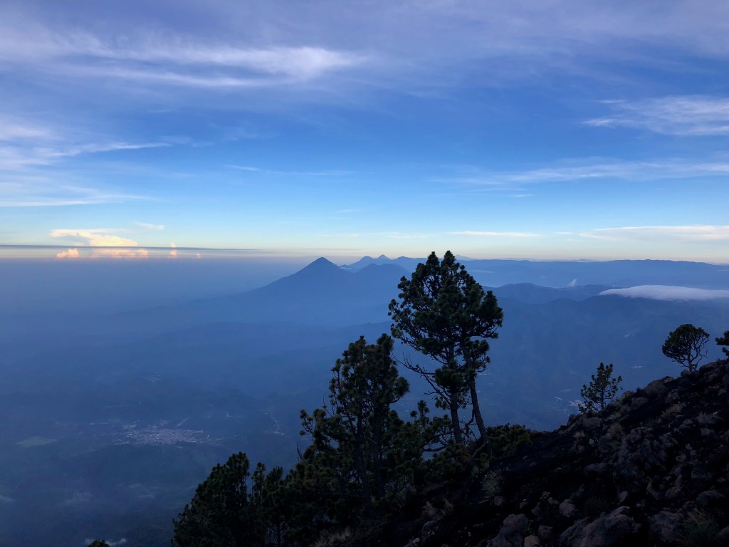 Au sud, l’Agua se réveille entouré d’une écharpe légère et moutonneuse, tandis qu’au loin des orages grondent encore. À l’ouest, El Fuego crache ses derniers tisons, que la lumière faible ne dissimule pas encore. Je laisse Arlette, dont le visage ne trahit plus rien d’autre qu’un doux émerveillement, devant les éruptions magiques, et oblique vers l’arrête nord. De là, on distingue en ombres chinoises le lac Atitlan et les trois volcans qui l’entoure, baignés dans une magnifique lumière bleue.