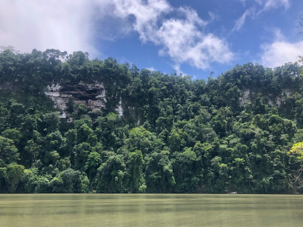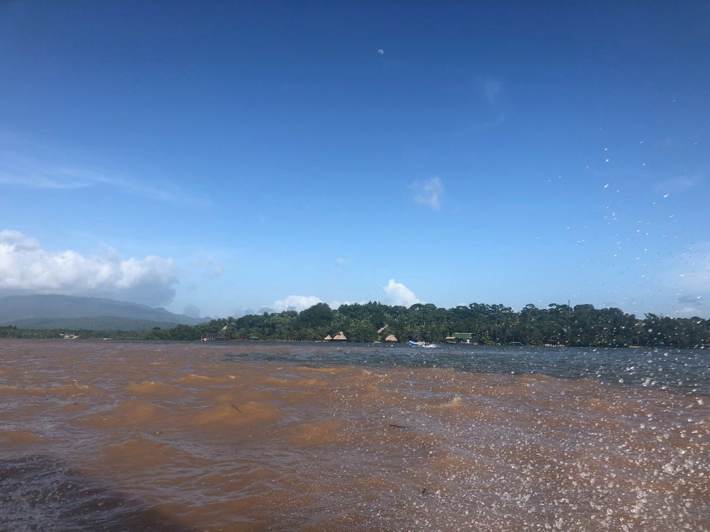 Mercredi matin, Round House Hostel. Pluie et orages ont à nouveau rythmé notre nuit, mais nous nous levons sous un soleil timide. Carlos est bavard ce matin, et nous raconte sa vie sur le fleuve depuis un an qu’il travaille à l’auberge. Vers 10h, la lancha collective, pleine à craquer, nous prend à son bord. Nous saluons notre hôte et sa gentille famille, et redécouvrons les rives du Rio Dulce sous une autre lumière.