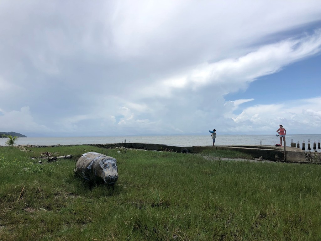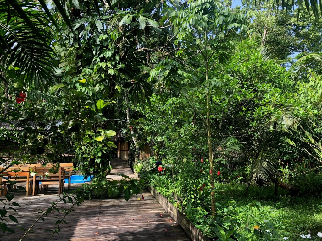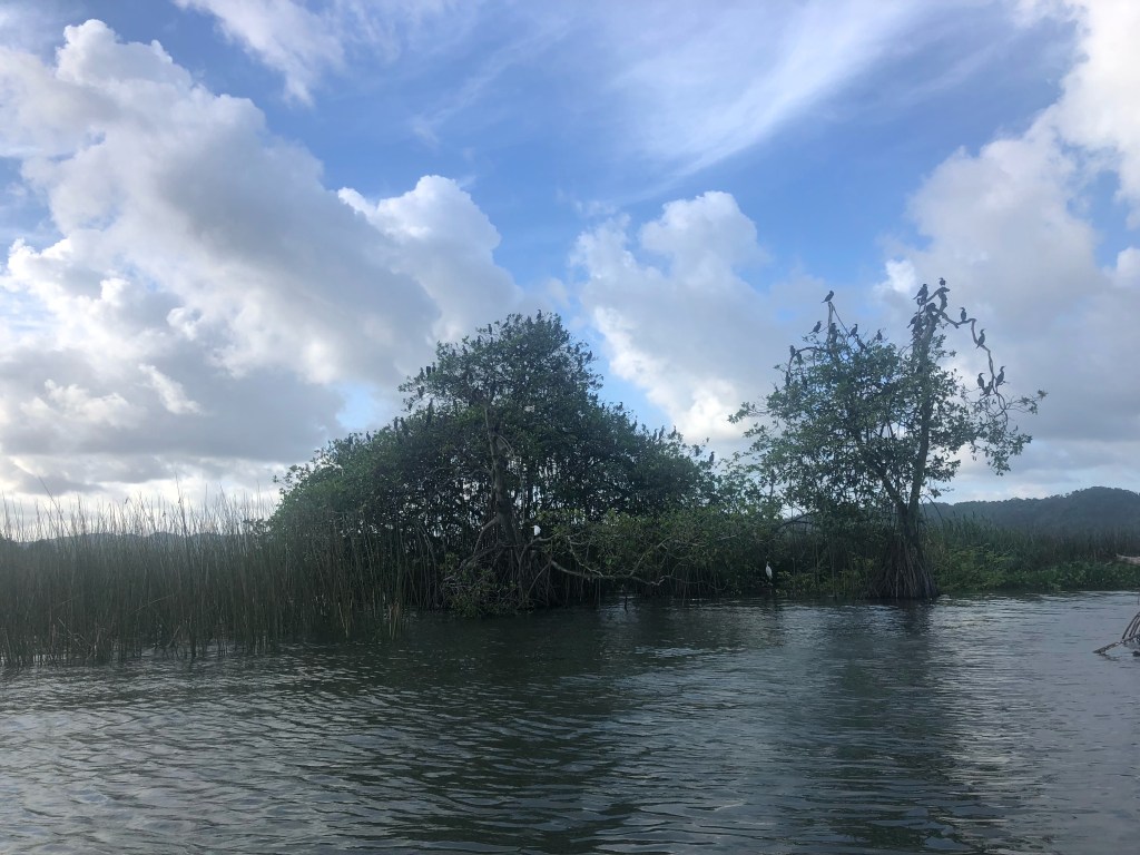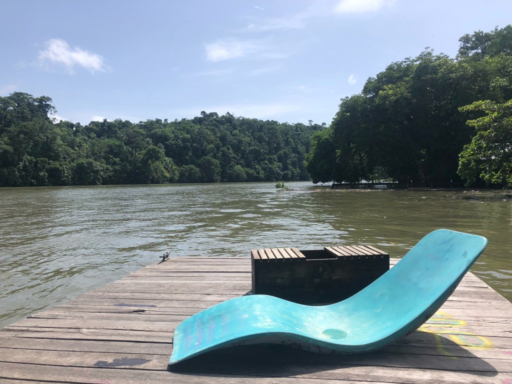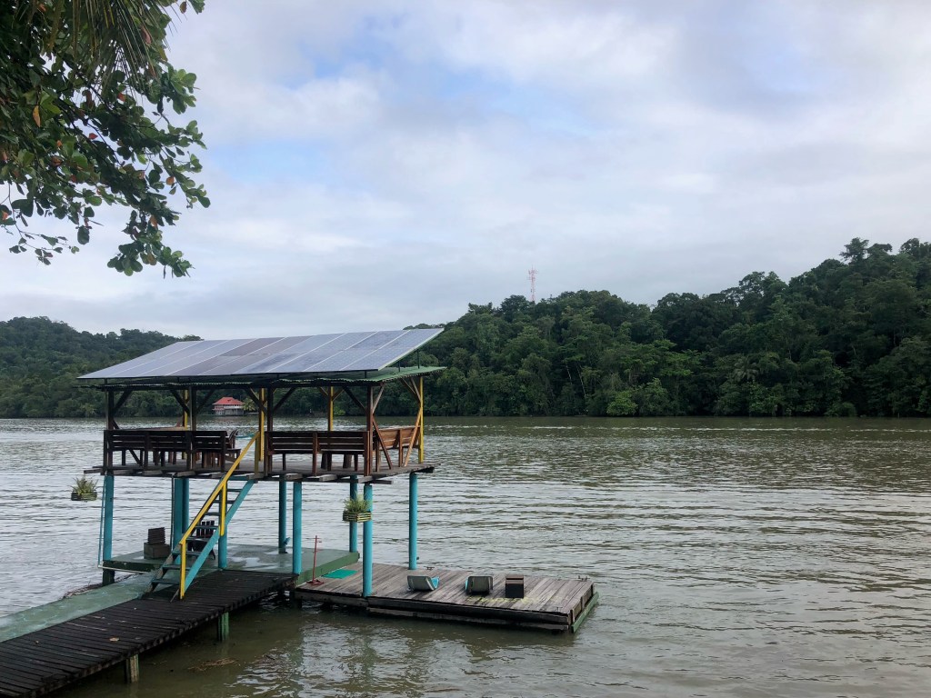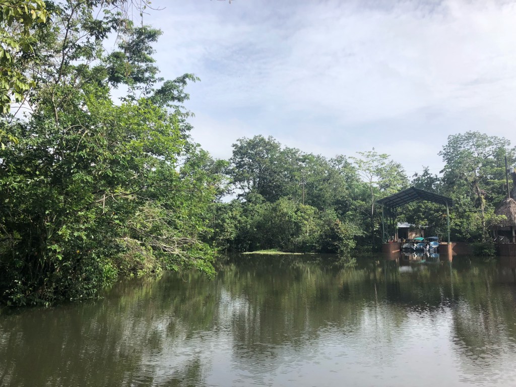 La rivière coule jusqu’à la Côte caribéenne, et c’est à une dizaine de kilomètres de celle-ci que se trouve la Round House. Nous y accostons après une charmante ballade en bateau de 45 minutes, passant par de verdoyants îlots où nichent cormorans et aigrettes royales. Nous avons partagé la lancha avec quatre frères et sœurs, âgés de 9 à 25 ans, venus rendre visite à leur frère qui travaille à l’auberge.