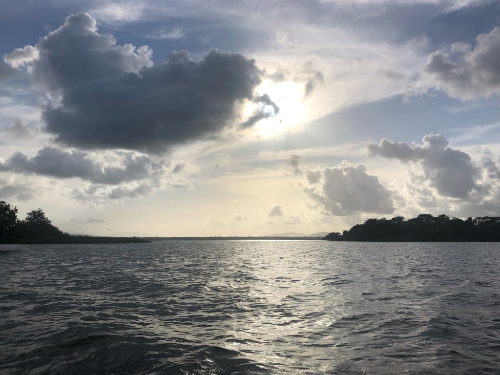 Mardi matin, sur les bords du Rio Dulce. Il pleut encore alors que nous dégustons les pancakes préparés par Jorge, le cuisinier et co-gérant des lieux, à peine plus âgé que Carlos. Il nous promet le soleil d’ici une heure ou deux. Et en effet celui-ci fait son apparition alors que nous mettons à l’eau le kayak qui nous permettra de rallier la côte, et le village de Livingstone. Le courant, favorable, nous aide à rejoindre l’estuaire, naviguant à travers cette rivière si sauvage. Les collines luxuriantes plongent dans les eaux brunes du rio, survolées par des escadrons d’aigrettes.