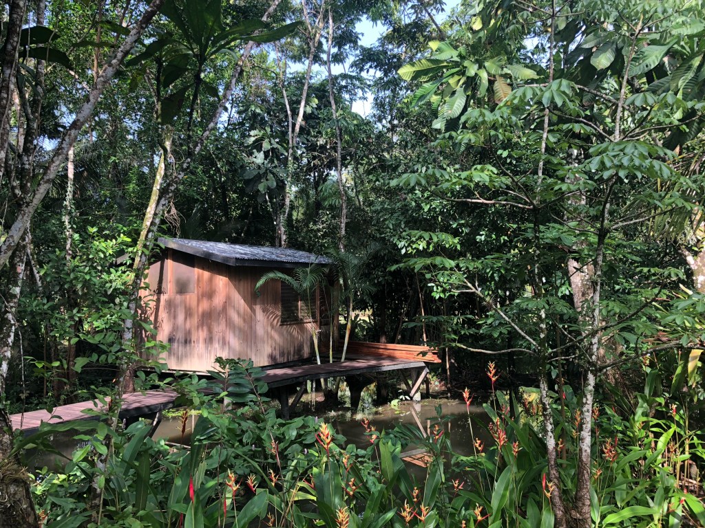 Carlos, sourire juvénile laissant apparaître son appareil dentaire, nous accueille chaleureusement, après avoir salué comme il se doit sa fratrie. Seuls clients de l’établissement, nous occupons un bungalow en surplomb, simple et rustique, immergé dans la jungle. Amusés, nous découvrons notre salle de bain en plein air, la douche posée au pied d’une paroi de pierre, où s’ébattent une multitude de petits crabes de rivière. Pas de scorpions en vue, ouf.