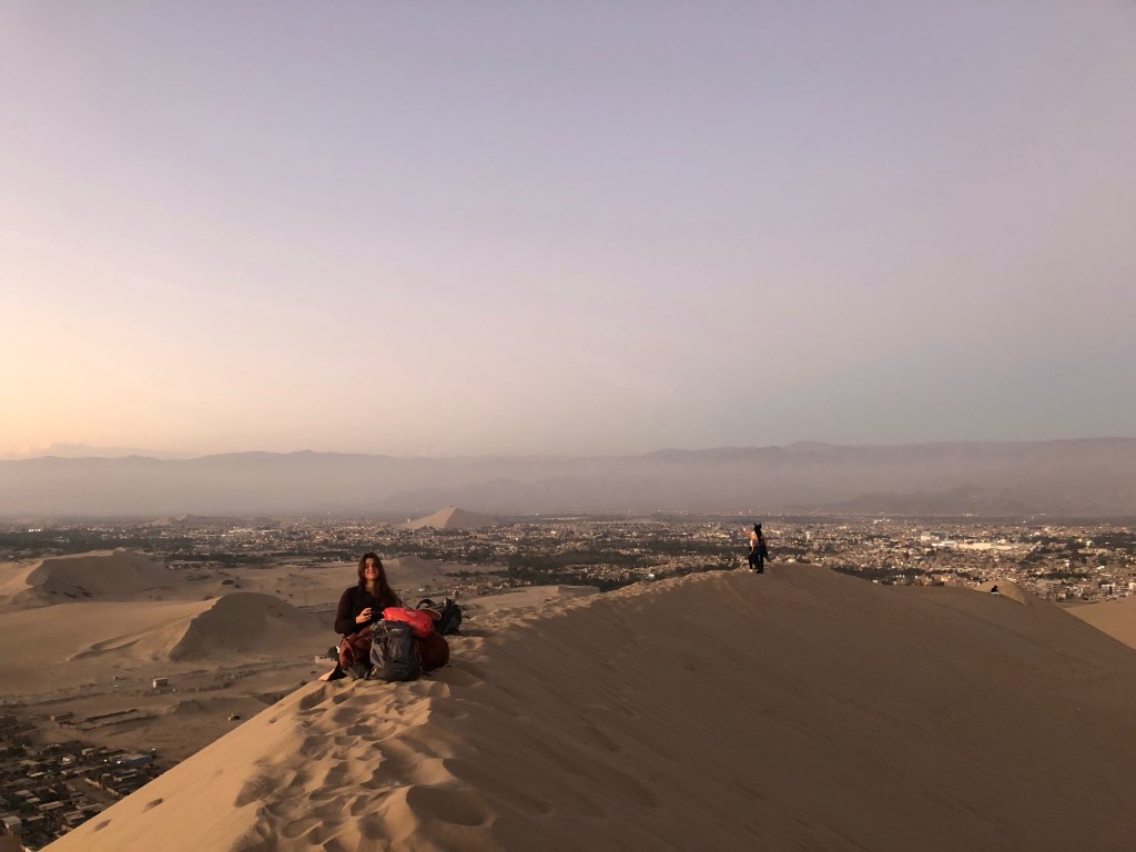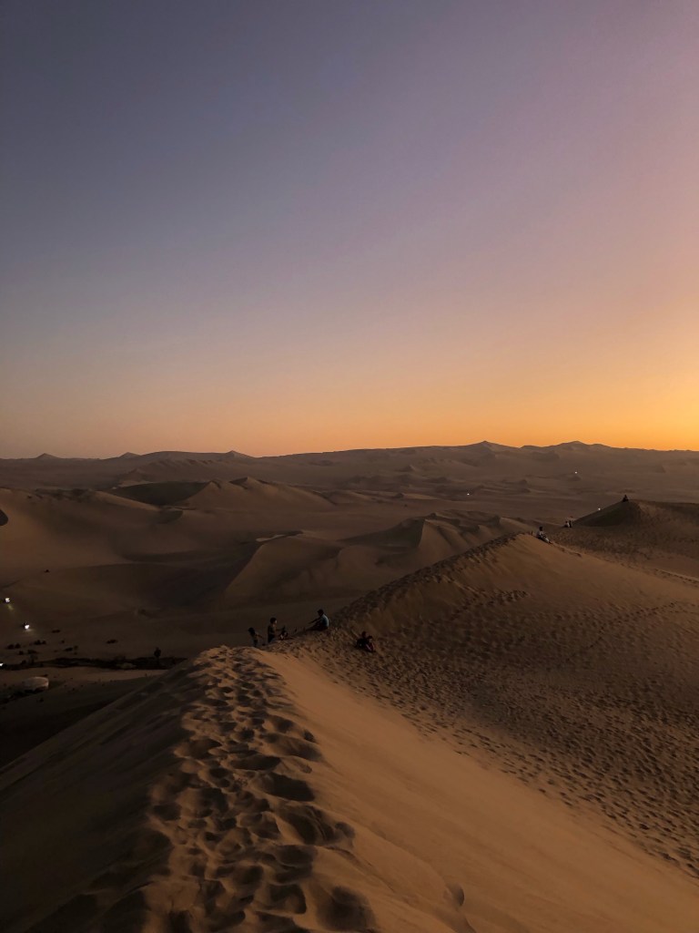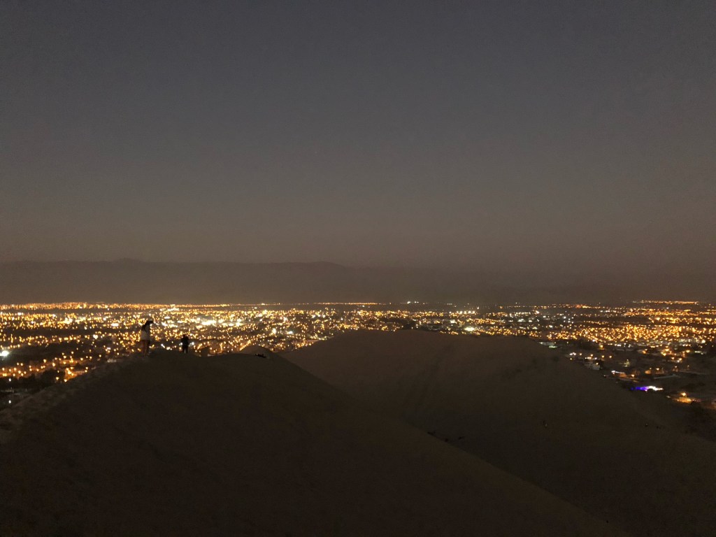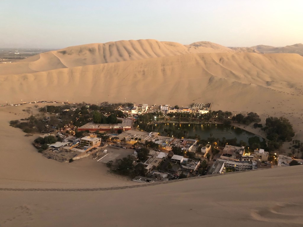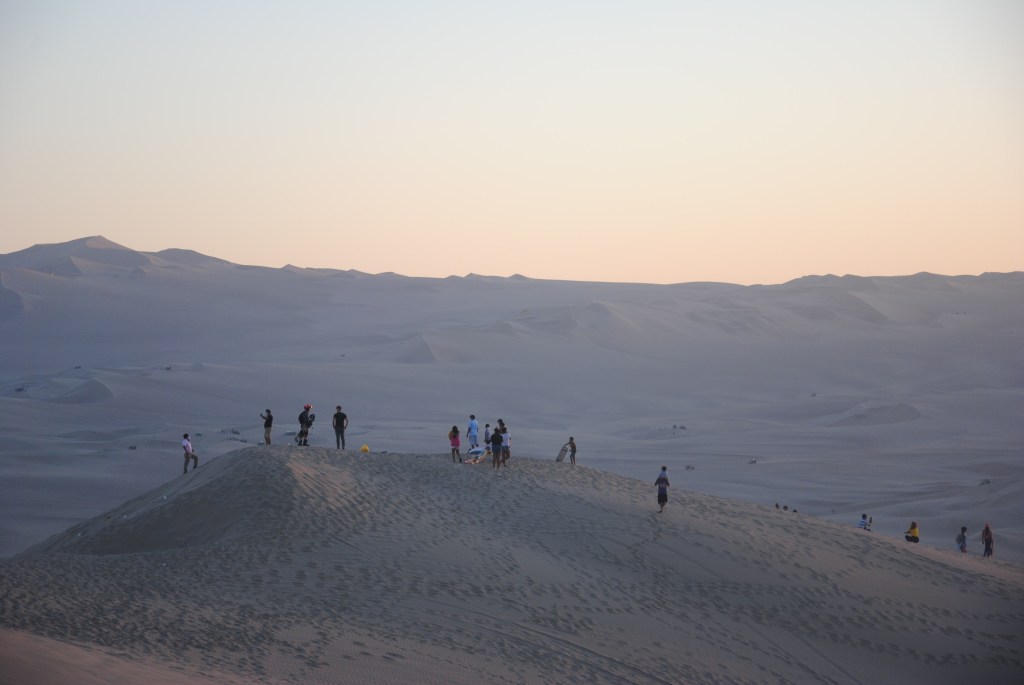La nuit tombe sur Huacachina, ce petit Disneyland des sables. Nous dévalons la pente jusqu’à l’oasis, vidons les quelques litres de sables de nos chaussures, et traversons le Malecón jusqu’à l’Hostel Boulevard. L’endroit est bondé de touristes locaux, et y résonne la traditionnelle cacophonie aux accents reggaetoniens. Amusant ! Notre chambre, malgré un soin prononcé, se transforme vite en petit Sahara. Dessablés, nous sortons dîner dans l’un des quelques restaurants du pueblo, choisissant le moins bruyant. Nous attendons trois quarts d’heure des pizzas immangeables, et rentrons bien vite nous coucher, en attendant de doux rêves bleus dans ce pays des milles et une nuits miniature.