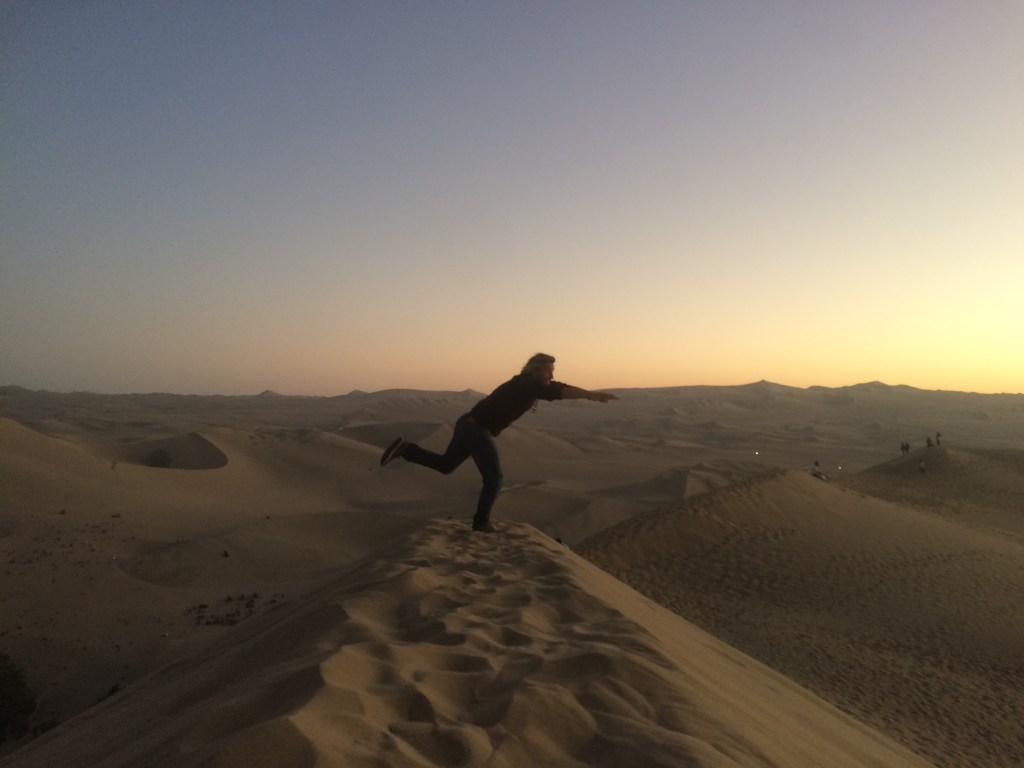Le bus est en retard. Voilà qui compromet nos projets de coucher du soleil en haut des dunes surplombant la petite oasis de Huacachina…Le combi, plein, arrive à 15h30. Nous prenons place et s’engage alors une course contre la montre : le soleil se couche à 18h précise. Problème, le chauffeur ne prend pas la direction d’Ica, la grande ville qui abrite l’oasis, mais bien celle de la réserve. Il doit charger deux touristes qui se sont perdus là-bas. Après une bonne vingtaine de minutes à les chercher, nous les trouvons sur le bord de la route, et ils n’ont pas le temps de s’assoir que notre pilote fonce à toute blinde vers Ica. De son audace dépendra peut-être notre sunset…Mais, alors que nous sommes dans les temps, ça bouchonne sec à l’entrée de la ville. Pire, l’unique route qui mène à Huacachina (à une demi-douzaine de kilomètres d’Ica), est totalement prise d’assaut par des foules de badauds venus voir le soleil disparaître. Qu’à cela ne tienne, nous descendons du bus, et filons au petit trot, nos bardas sur le dos (et le ventre…), dépassant un à un les candidats à l’ascension. Pas le temps de passer à l’hôtel. Il est 17h24. Chargés comme des mules, nous nous engageons sur la dune, alors que derrière nous la plupart ont renoncé. Galvanisés par l’enjeu, nous progressons rapidement malgré nos pieds qui s’enfoncent dans le sable fin à chaque foulée. À mi-parcours, nous sommes trempés de sueur, mais un coup d’œil à ma montre (17h32) invite à l’optimisme. Encore un petit effort ! L’ultime pente, vicieuse et glissante, est bien vite effacée, et nous jetons nos sacs sur l’arrête de la dune à 17h46. We did it !