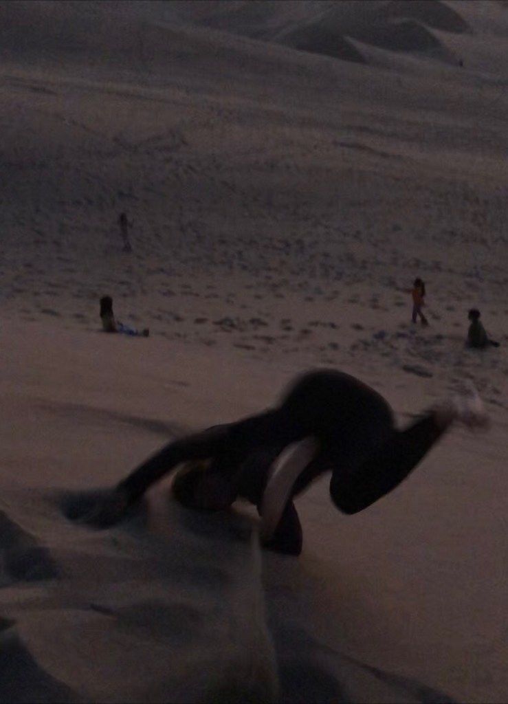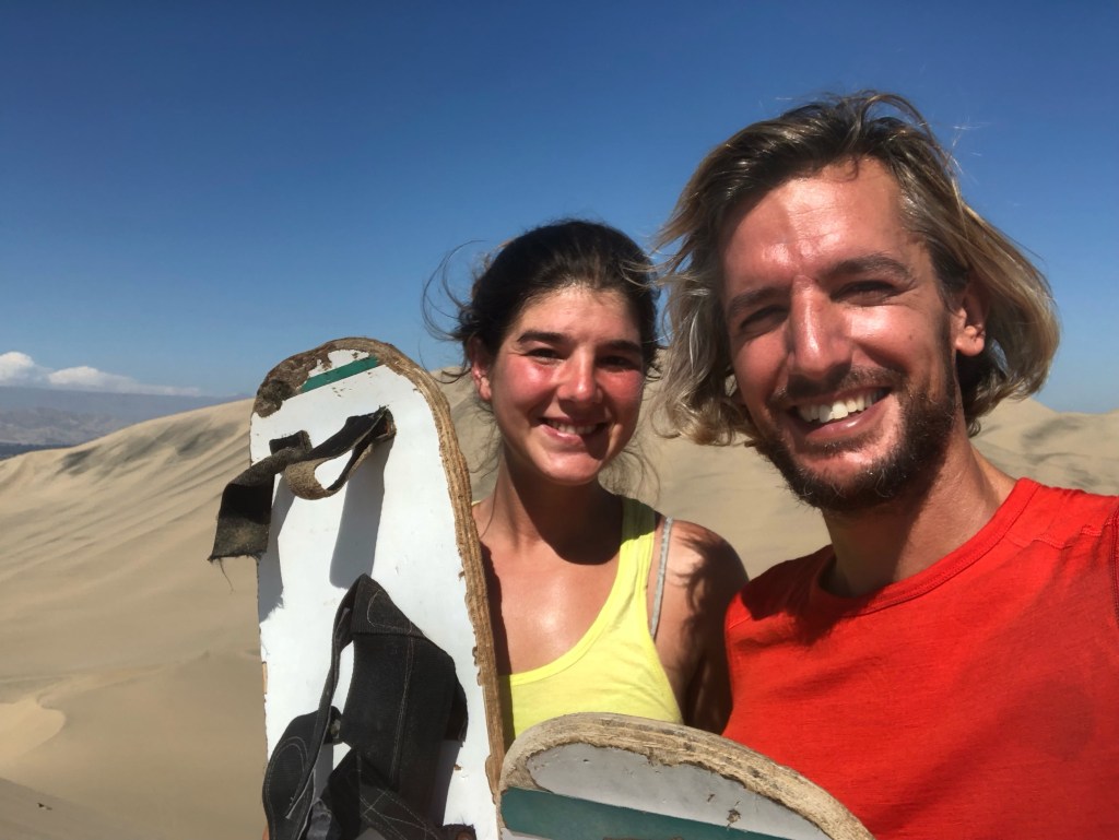 Puis, armés des sandboards totalement décrépis empruntés à l’hostel, nous escaladons à nouveau les dunes de Huacachina. Mais vers le Sud cette fois, là où la pente est plus raide. Je donne des conseils inutiles à Arlette, encore novice en glisse, nous prenons position sur nos planches, sans fixations aucunes, et attaquons la descente. Les premiers essais sont catastrophiques. Mais à force d’abnégation, nous parvenons à réaliser une paire d’honorables descentes.