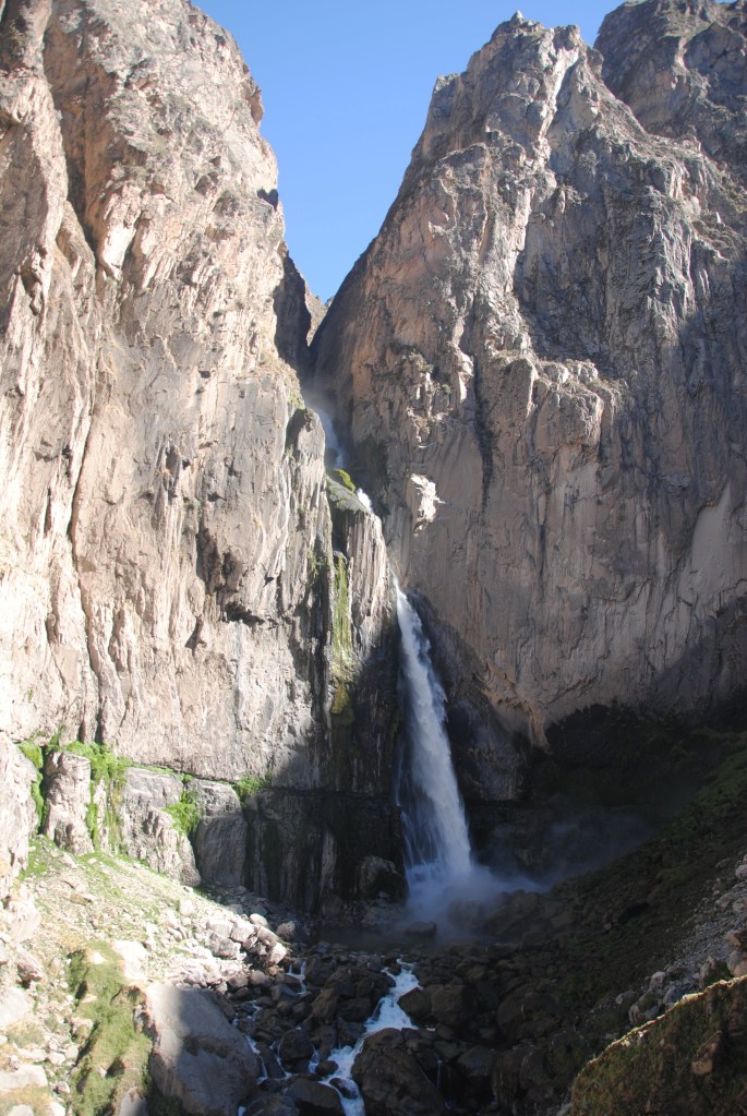 Vendredi matin, Fure. La nuit a été plutôt confortable, et clémente en termes de température. Nous n’avons néanmoins que très peu dormi, pourtant pas dérangés par les ouvriers, d’une discipline monacale. Un peu groggy, nous plions la tente et partons pour un aller-retour à la Catarata de Huaruro, première étape de notre journée avant de rallier l’oasis de Sangalle. La cascade se trouve au fond d’un étroit canyon, parallèle au Morollo. En chemin, nous découvrons une autre cascade, sublime, entourée de végétation luxuriante, îlot de verdure au milieu d’une paroi jaune et grise. La cascade de Huaruro, plus imposante, est magnifique aussi, dans un style plus industriel. Une massive colonne d’eau sortie d’une étroite fente de la montagne s’abat à grand bruit dans un petit bassin. Nous petit-déjeunons en regardant le soleil dévorer petit à petit la montagne. Les colibris verts et gris se régalent de fruits mûrs dans le fond verdoyant du canyon. Sans autre son que ceux émanant des oiseaux-mouches et des eaux galopantes, le moment est délicieux.