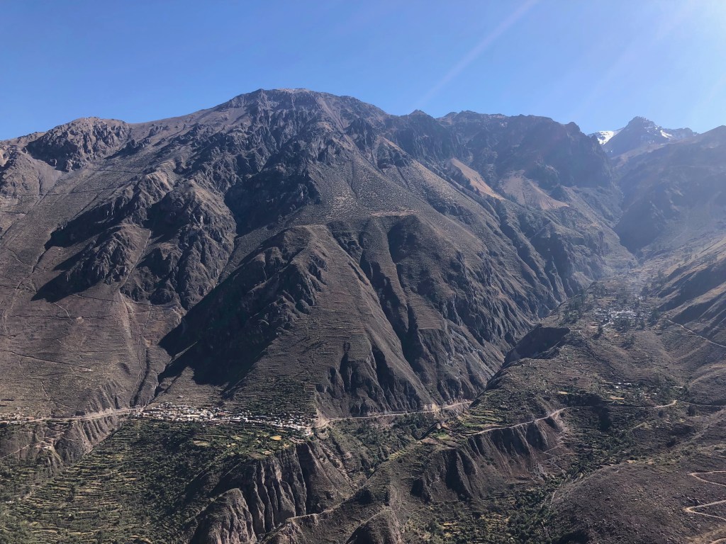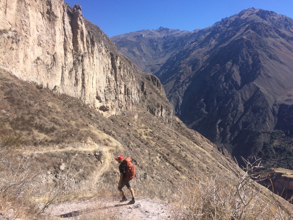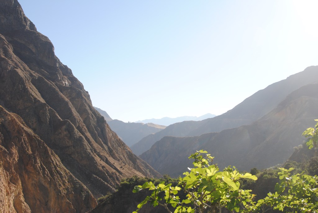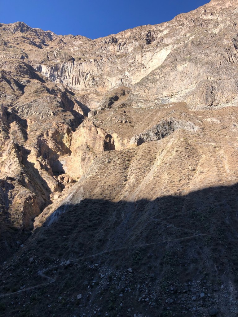 Dimanche matin, San Juan de Chuccho. À voir le soleil colorer doucement l’impressionnante montagne que nous devons gravir tout à l’heure, je me dis que, à crapahuter dans le canyon depuis trois jours, nous oublions parfois à quel point cet endroit est incroyablement beau. Sur ces considérations poétiques, après avoir chaleureusement remercié Gloria, nous partons pour Cabanaconde, afin de boucler la boucle. La descente vers le pont San Juan est rapide, et, une fois la rivière traversée, ne reste plus qu’un colosse de 1300m de haut à gravir. Nous progressons le long d’un sentier en lacets réguliers, parfois creusé à même la falaise ! La marche est superbe, nous bénéficions au fur et à mesure que nous prenons de l’altitude de vues magnifiques sur les lieux traversés les jours précédents. Tapay conserve notre préférence, et paraît si petit, posé au fond de son canyon.