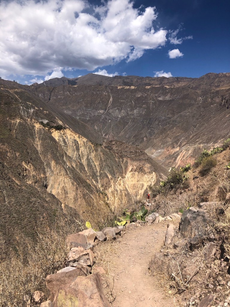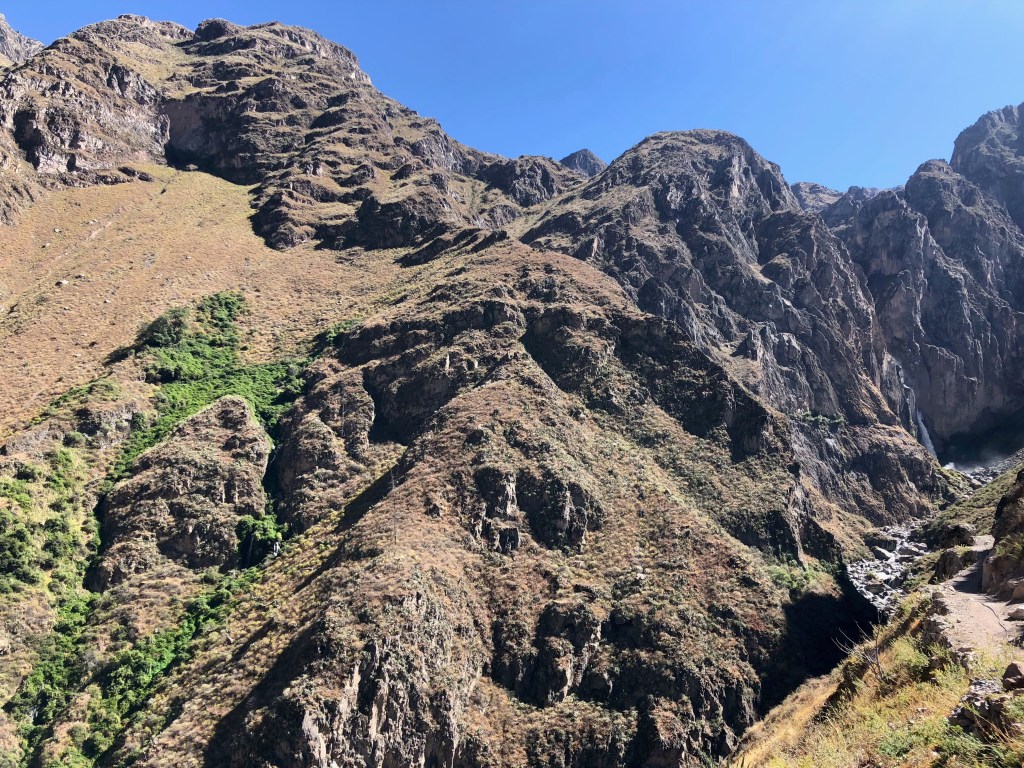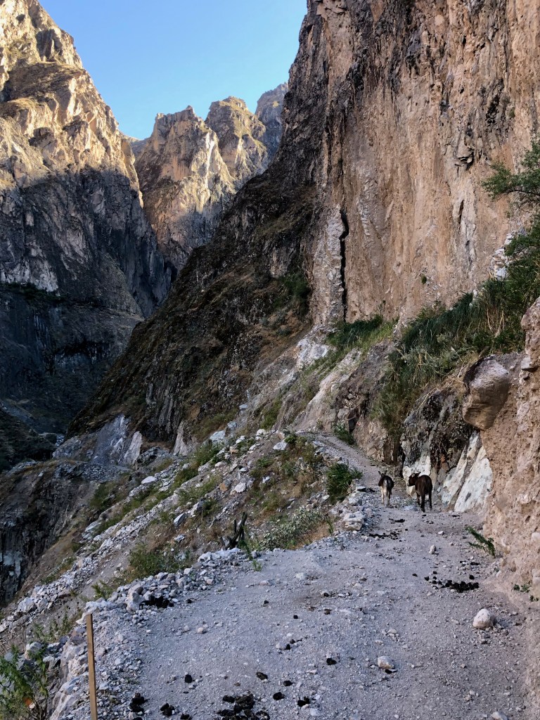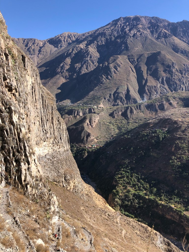 Dimanche matin, San Juan de Chuccho. À voir le soleil colorer doucement l’impressionnante montagne que nous devons gravir tout à l’heure, je me dis que, à crapahuter dans le canyon depuis trois jours, nous oublions parfois à quel point cet endroit est incroyablement beau. Sur ces considérations poétiques, après avoir chaleureusement remercié Gloria, nous partons pour Cabanaconde, afin de boucler la boucle. La descente vers le pont San Juan est rapide, et, une fois la rivière traversée, ne reste plus qu’un colosse de 1300m de haut à gravir. Nous progressons le long d’un sentier en lacets réguliers, parfois creusé à même la falaise ! La marche est superbe, nous bénéficions au fur et à mesure que nous prenons de l’altitude de vues magnifiques sur les lieux traversés les jours précédents. Tapay conserve notre préférence, et paraît si petit, posé au fond de son canyon.