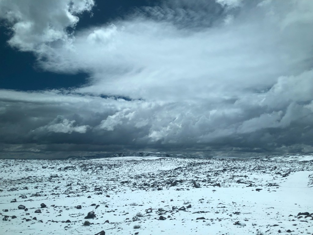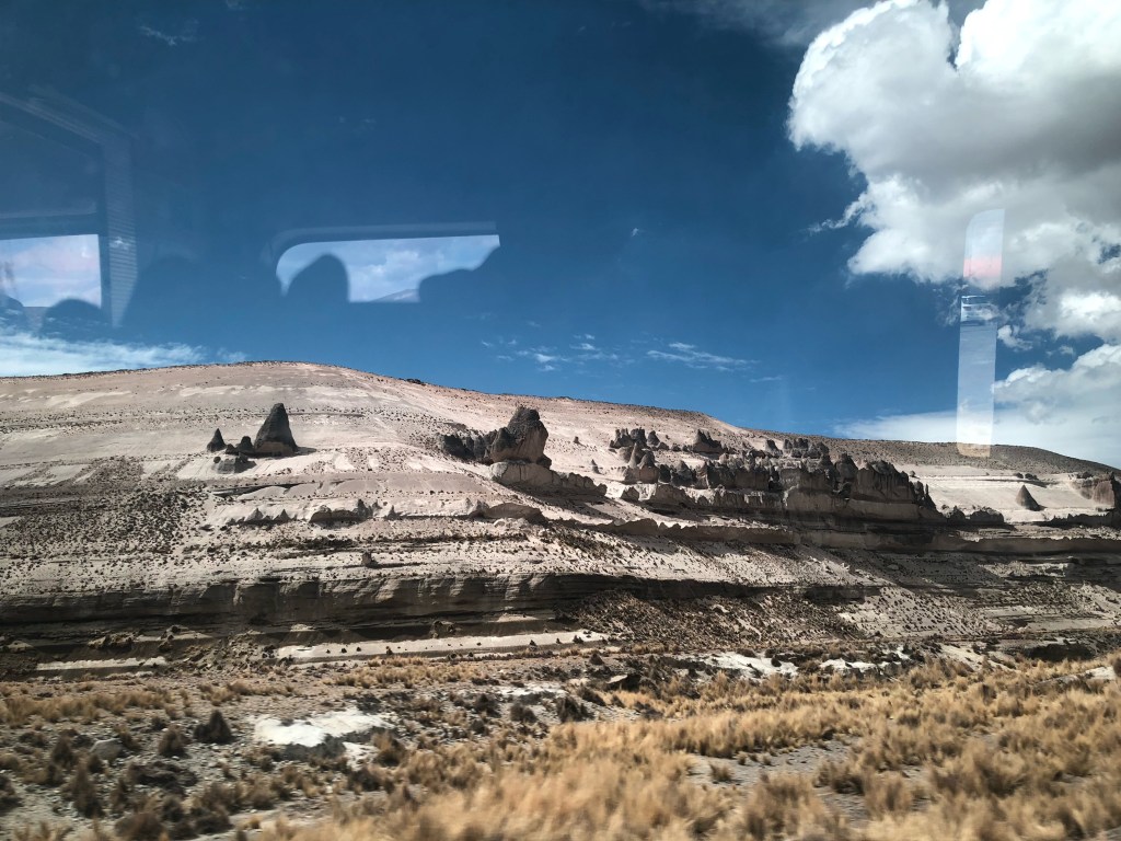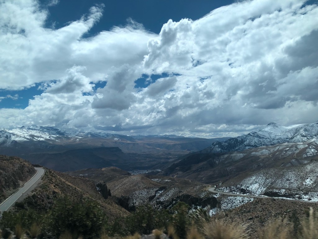 La route grimpe encore, et au moment où (spoiler alert) le second megalodon mange le premier, le paysage se couvre de neige. De grands et denses nuages blancs balayent les sommets des montagnes. Pas même l’epilogue ébouriffant de notre navet aquatique ne parvient à décoller nos yeux de la vitre tant la vue est époustouflante ! La route redescend à l’approche de l’entrée du Canyon de Colca, mais quelques traînées de neige s’accrochent encore aux montagnes qui bordent l’arrivée à Chivay.