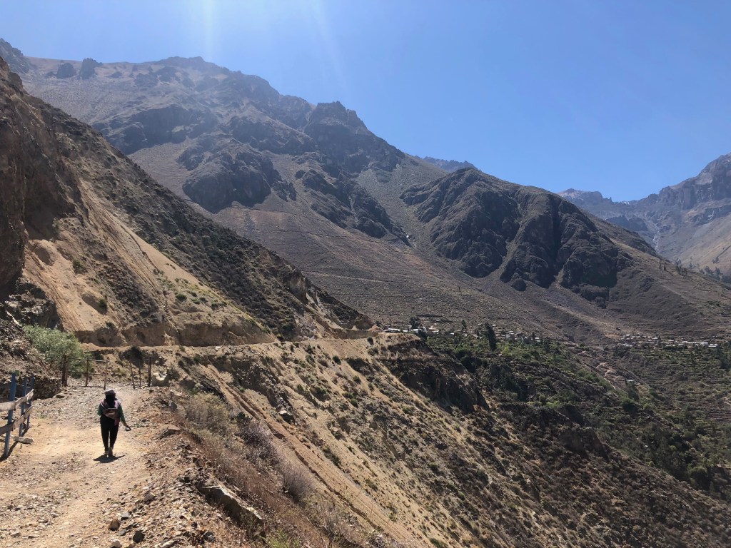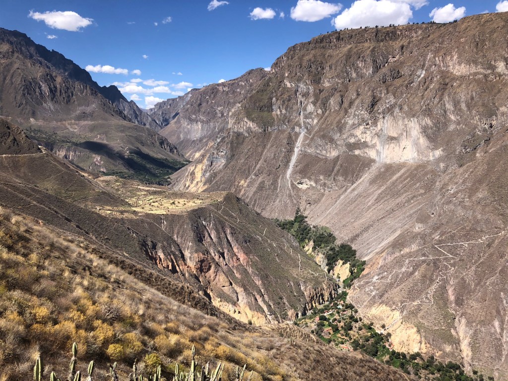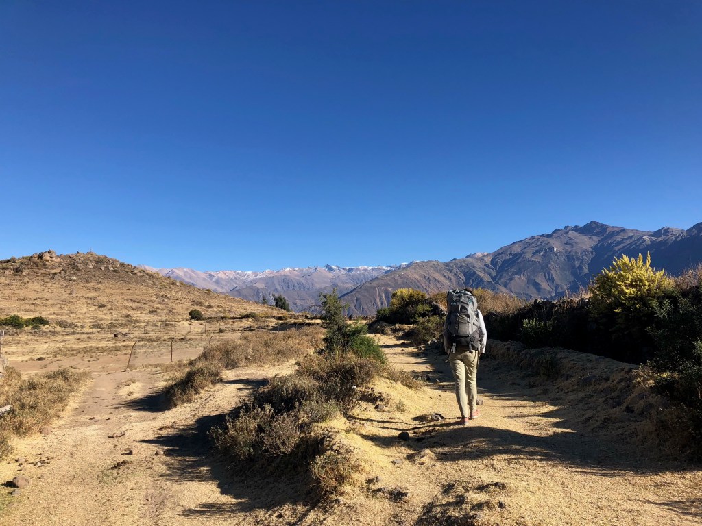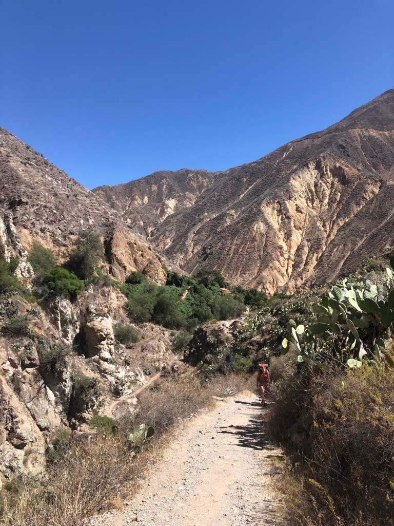 Nous reprenons nos esprits en rigolant, puis continuons l’ascension jusqu’au hameau de Belen, où le sentier oblique à l’est, et retrouve le canyon de Colca. Au Mirador Apacheta, qui offre une superbe vue sur l’oasis luxuriante en contrebas, nous entamons notre descente vers Sangalle.
