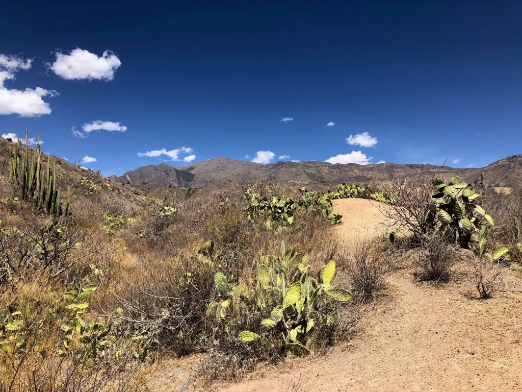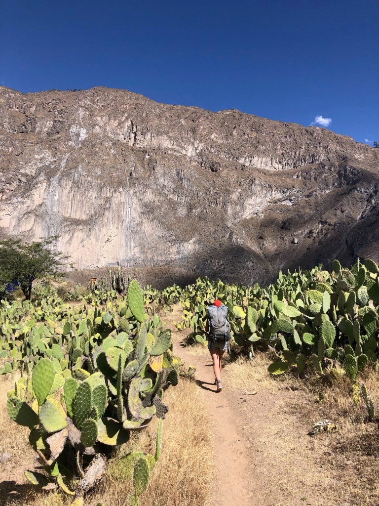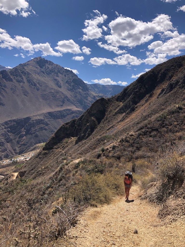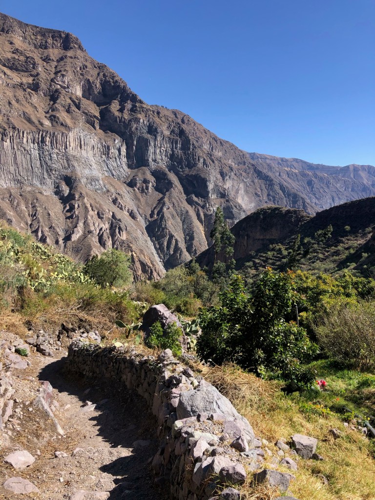 Nous reprenons nos esprits en rigolant, puis continuons l’ascension jusqu’au hameau de Belen, où le sentier oblique à l’est, et retrouve le canyon de Colca. Au Mirador Apacheta, qui offre une superbe vue sur l’oasis luxuriante en contrebas, nous entamons notre descente vers Sangalle.