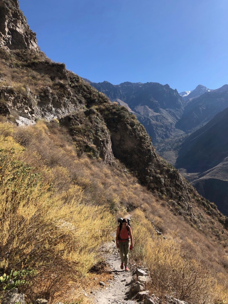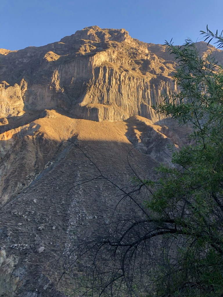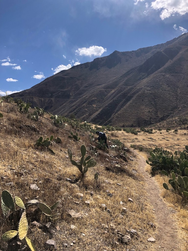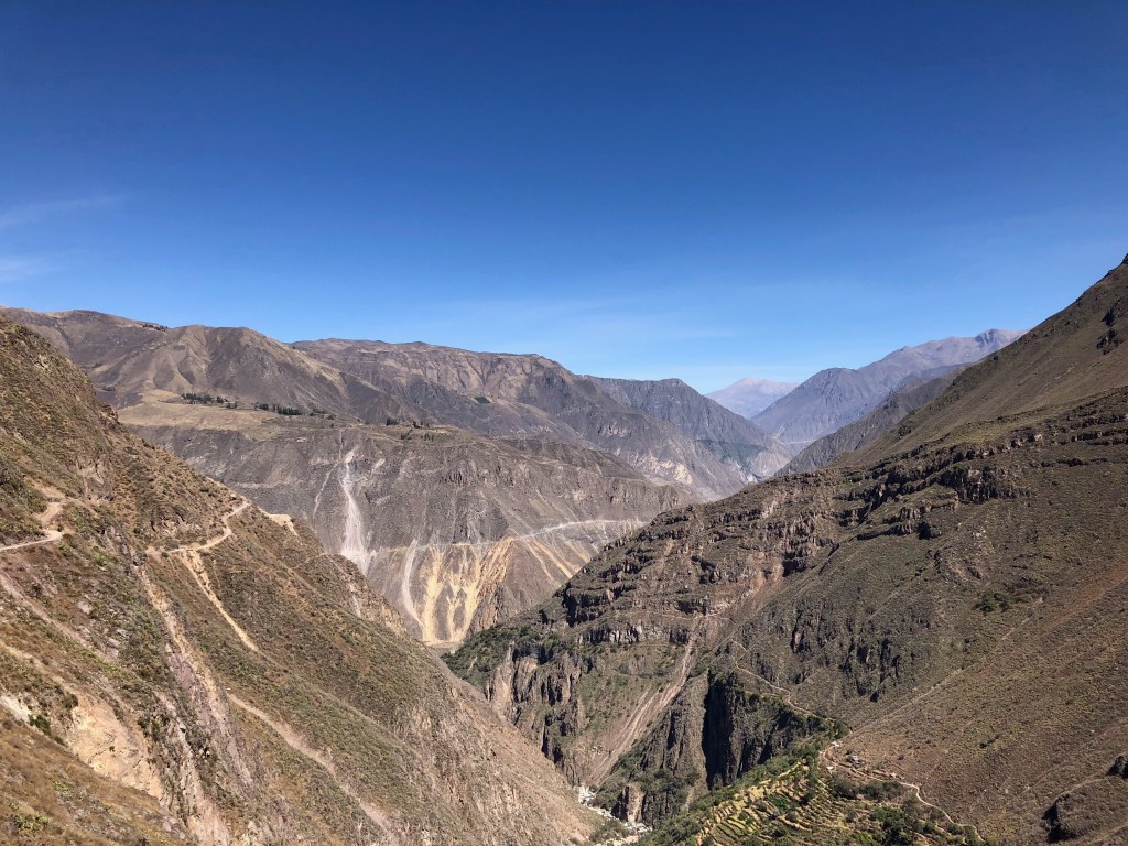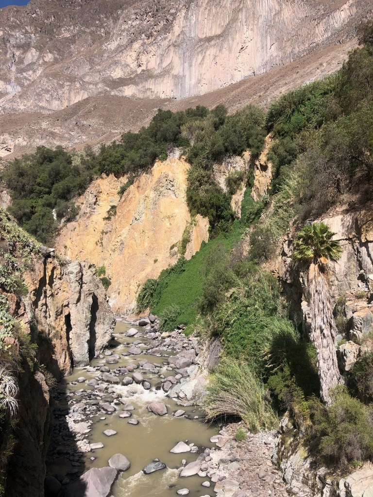Jeudi matin, Cabanaconde. La même équipe se retrouve au petit déjeuner, et nous poursuivons la discussion de la veille. La vénérable “abuela” est plus souriante qu’hier, mais néanmoins dépourvue de talent en mathématiques. Je l’aide à établir la cuenta, et nous saluons nos colocataires. Si tout va bien, nous devrions les retrouver le lendemain à l’oasis de Sangalle. Nous voilà parti à la découverte du Canyon de Colca ! Il est 7h45, et, déjà, le soleil sévit de ses chauds rayons. Nous marchons le long du canyon, sur un grand plateau couleur or. Nous y admirons l’agriculture en terrasse si typique des Andes, avant de descendre vers la rivière, en lacets à travers un encaissement étroit.