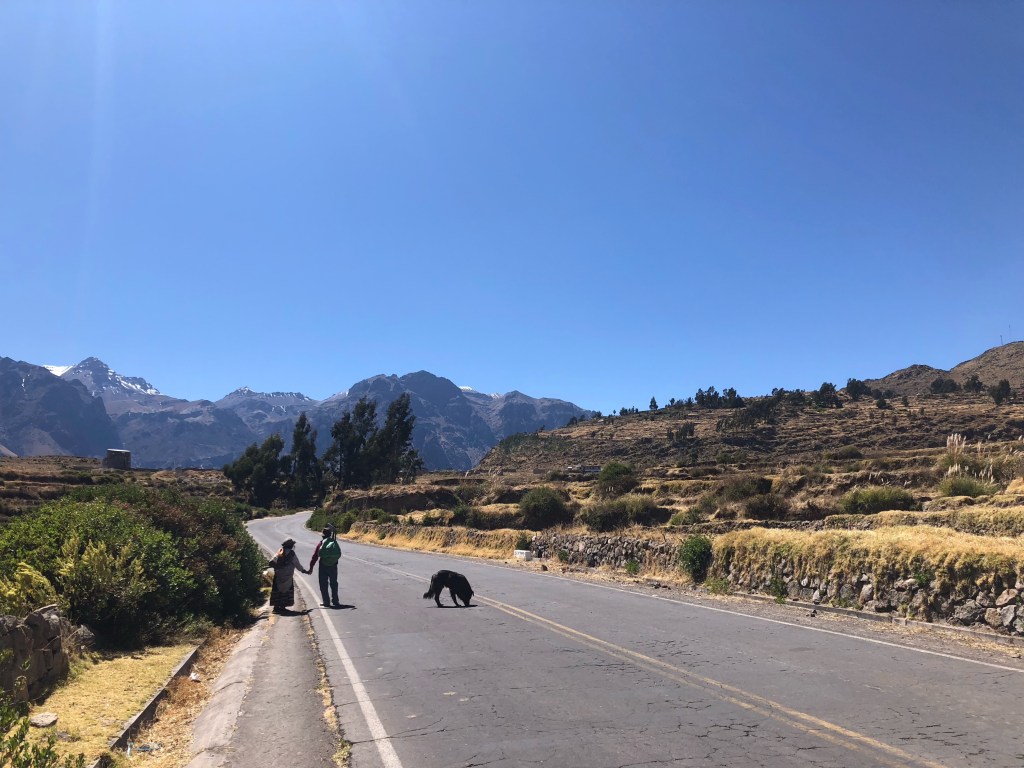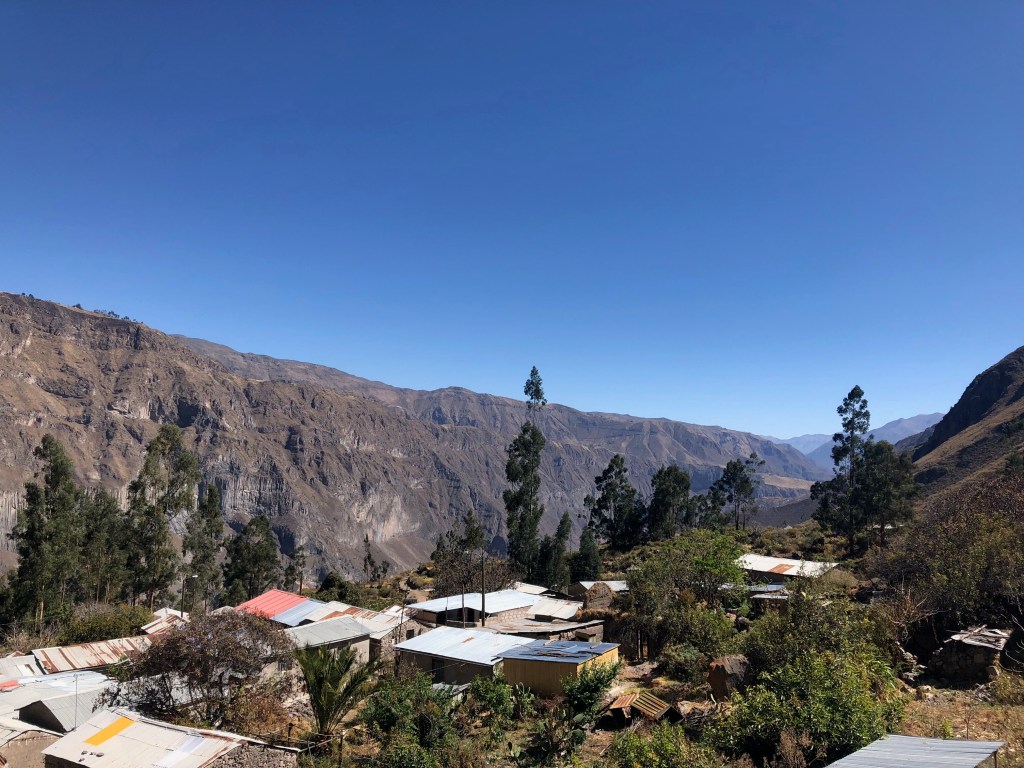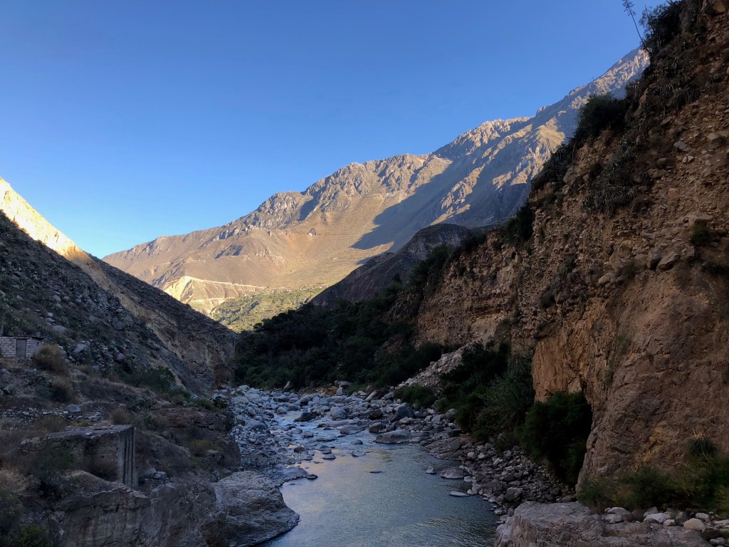 Nous traversons le Rio Colca, lent et peu profond à cet endroit, et remontons vers le hameau de Llahuar. Ici, le Rio Colca est rejoint par le Rio Molloco, au débit bien plus important. Nous souhaitons y faire une courte halte, afin d’acheter de l’eau et des vivres pour notre nuit sous la tente dans le village abandonné de Fure. Llahuar abrite seulement deux familles, possédant chacune sa “posada”, sorte de maison d’hôte rustique, pour accueillir les randonneurs. La première maison est déserte, mais Miguel et sa mère Virginia nous accueille dans la seconde avec le sourire. Devant la faible affluence en ces temps de pandémie, ils n’ont néanmoins pas grand chose à nous offrir. Mais, grâce à leur bonne volonté, nous parvenons à acheter du pain, un avocat, des biscuits secs et de l’eau, dîner quatre étoiles en perspective. Miguel nous apprend alors que Fure n’est plus abandonné, mais investi par les ouvriers d’une entreprise de BTP qui travaille à l’acheminement d’eau potable de la cascade Huaruro au village de San Juan de Chuccho.