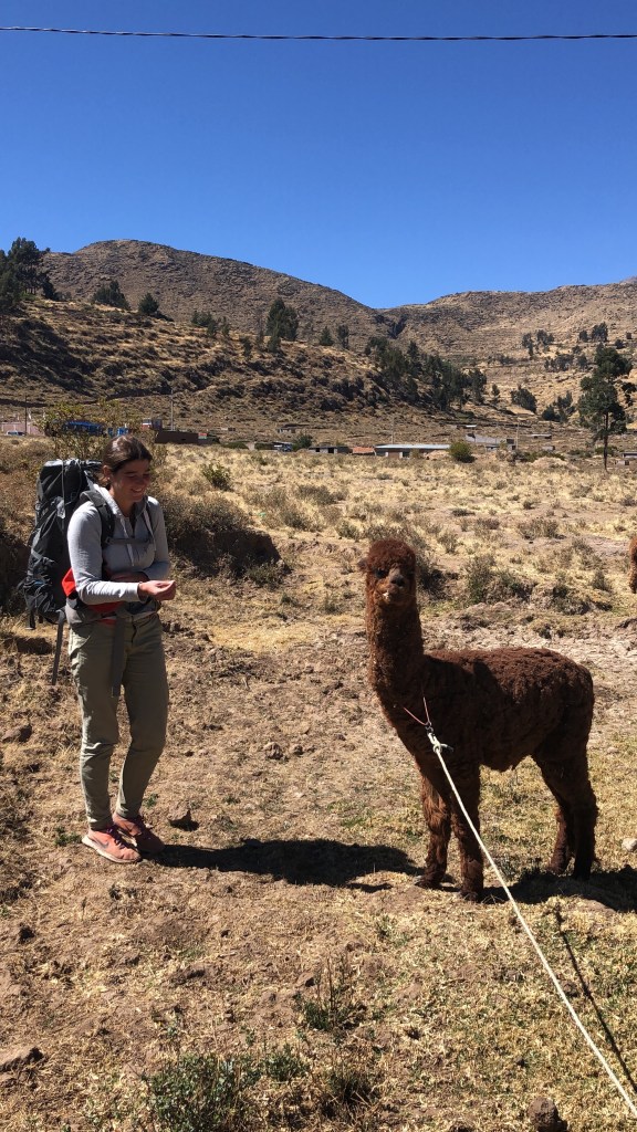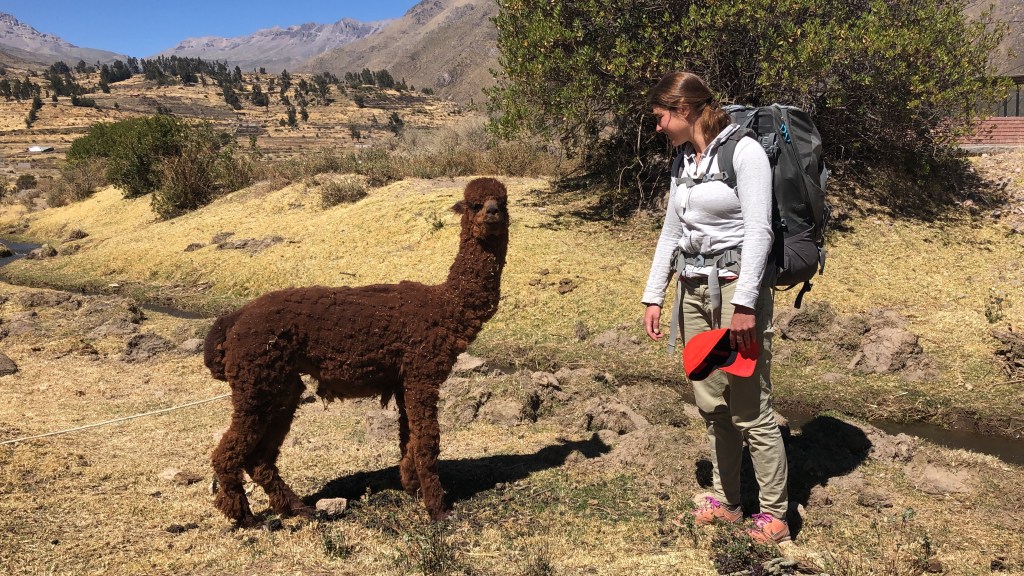 Le sentier contourne un arpent rocheux, et la vue s’ouvre encore d’avantage sur l’ouest du canyon de Colca. Il remonte à flanc de montagne jusqu’au mirador de Cusñirhua, point culminant de la journée. Nous faisons halte un long moment afin de contempler une dernière fois notre magnifique terrain de jeu des derniers jours. Cabanaconde est en vue et à une demi-heure à peine de marche. Quelques lamas bordent la route, et Arlette s’aventure à leur donner à manger. Je filme la scène en espérant évidement qu’elle subira le même sort que le capitaine Haddock dans Le Temple du Soleil, mais la jeune femme sait y faire avec les animaux et je ne repars qu’avec quelques jolies photos.