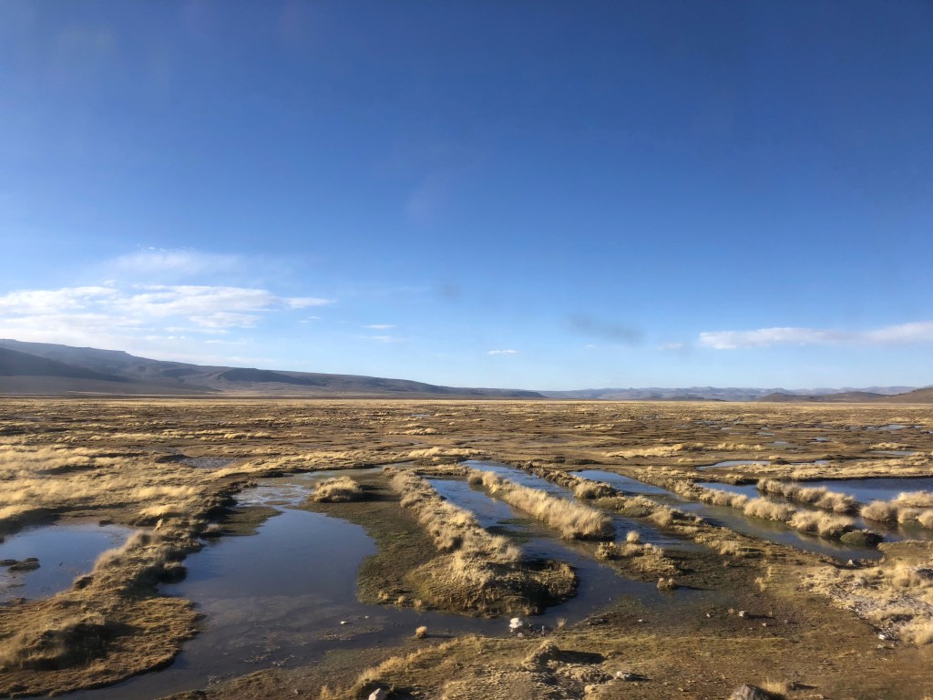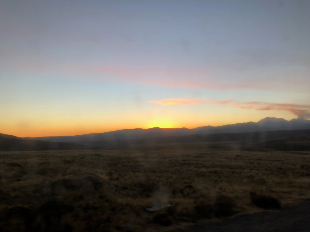 Dans le bus, alors que nous passons devant le Mirador Cruz del Condor, l’un de ces miraculeux oiseaux vole tout près, comme pour nous dire au revoir. Joli geste de la nature, qui fait écho aux salutations de cet autre condor (peut être le même ?) à notre arrivée dans la vallée il y a quelques jours. Nous regardons défiler le canyon jusqu’à Chivay, conscients de la chance que nous avons eu à l’explorer de l’intérieur. Sur la route du retour, lamas, alpagas et vigognes parsèment toujours le paramo. Mais un autre animal prodigieux s’invite à la fête : une vingtaine de flamants roses picorent dans une tourbière ! Le soleil se couche derrière les collines fauves des hauts plateaux, et la nuit recouvre les invraisemblables paysages neigeux d’un voile obscur.