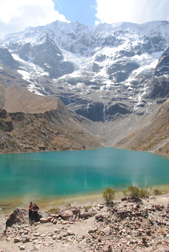 Derrière nous se dresse le Humantay, austère et altier, avec son mur noir où s’accrochent miraculeusement d’épaisses poches de glaces. La beauté du paysage me fait oublier le temps : je suis parti depuis un long moment et Arlette doit s’inquiéter. Colin reprend du service et part en éclaireur, alors que je dévale la pente à allure modérée, me rappelant les déconvenues du Chachani. A mi-chemin, nous rencontrons Arlette qui en effet se faisait du soucis pour Colin, et nous regagnons la plage tous les trois.
