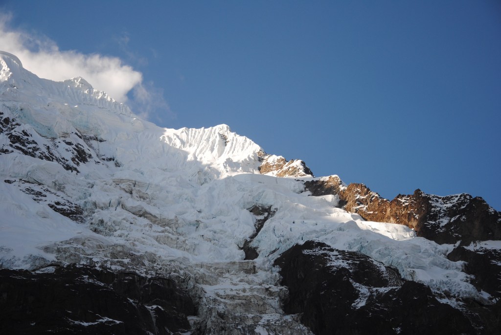 Jeudi matin, Cusco. Il est 4h. Il fait sombre et froid dans les rues venteuses de Santa Ana. Nous prenons place dans le mini van pour Mollepata, derrière le conducteur et l’unique passager, un péruvien mal dégrossi qui parle comme un charretier. Lorsque le collectivo part enfin, à 5h20, nous sommes frigorifiés et avons la tête pleine des incessantes et gutturales injections de notre bruyant voisin. Mais l’essentiel est ailleurs. Après une petite heure de route, nous apercevons une gigantesque montagne en forme de canine, dont les pentes enneigées émergent d’un horizon pourtant déjà vallonné. Le Salkantay promène sa mise glacée au gré des virages, jusqu’à disparaître tout à fait alors que nous entamons l’ultime montée vers Mollepata.