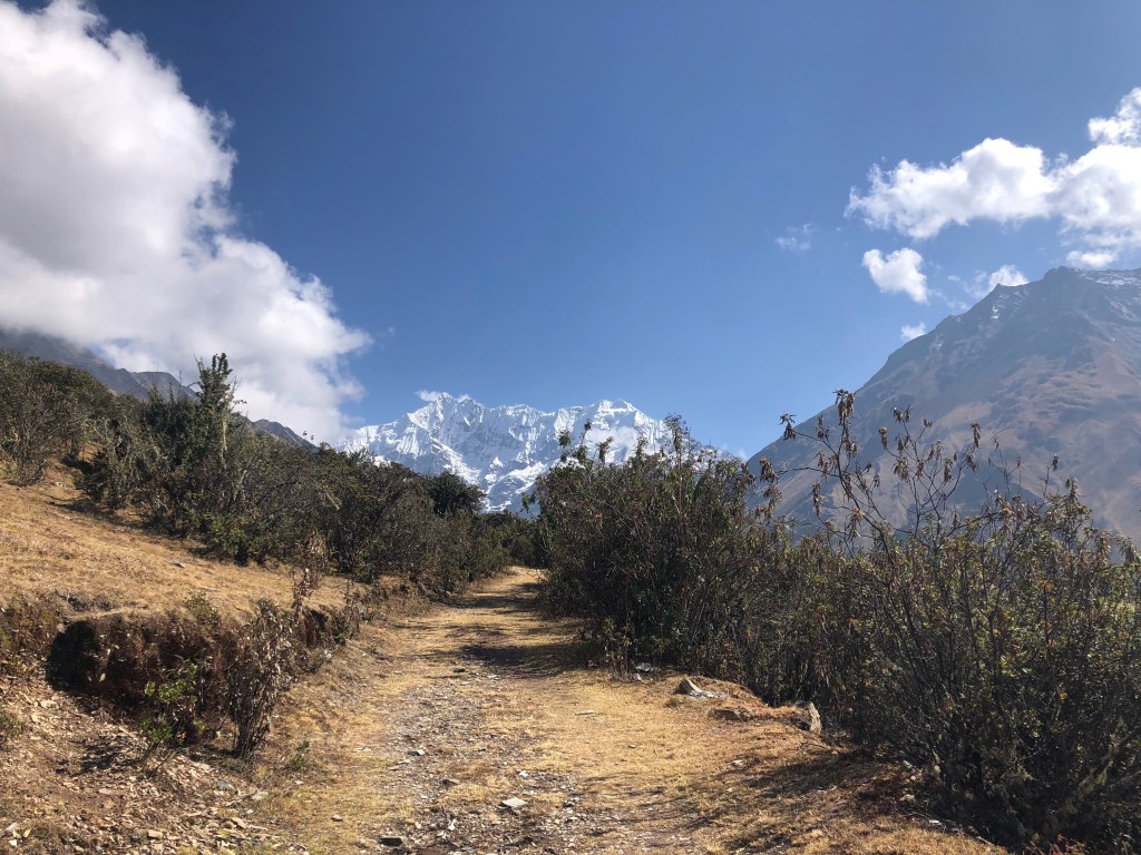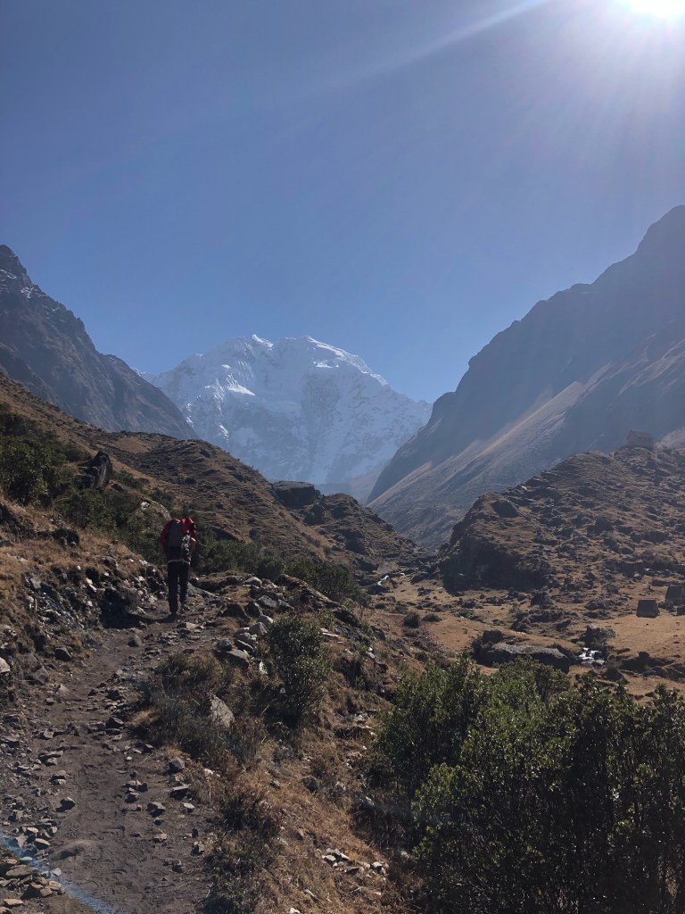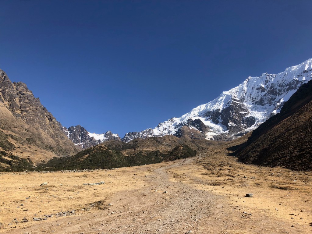 La journée de marche jusqu’à Chaullay promet d’être longue, nous passons ainsi rapidement le petit village, et fonçons droit vers le Salkantay, le long d’un joli ruisseau. La montagne semble bien loin, mais se rapproche à mesure que nous progressons dans ce paysage aux reflets ocres et dorés.
