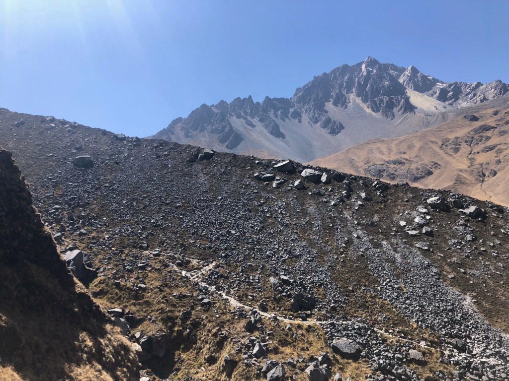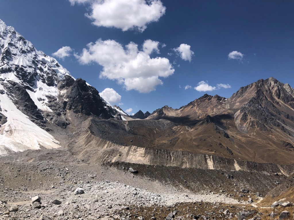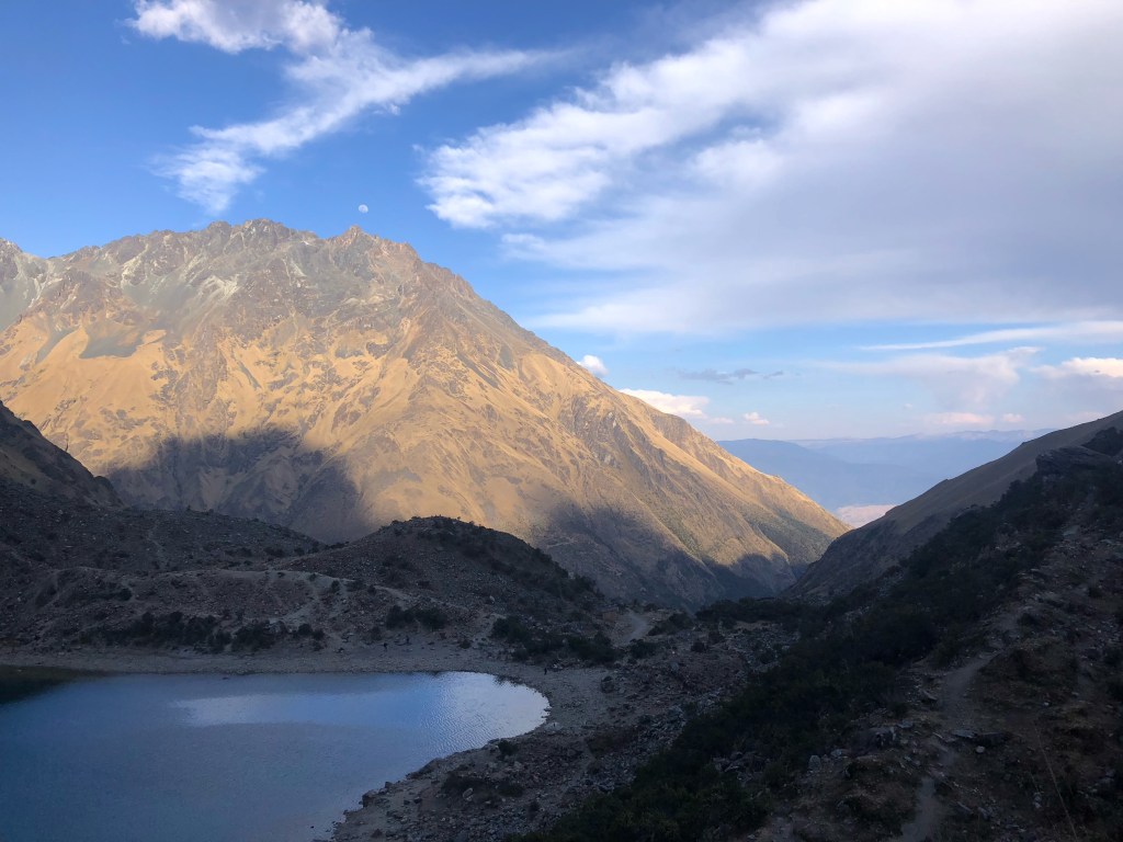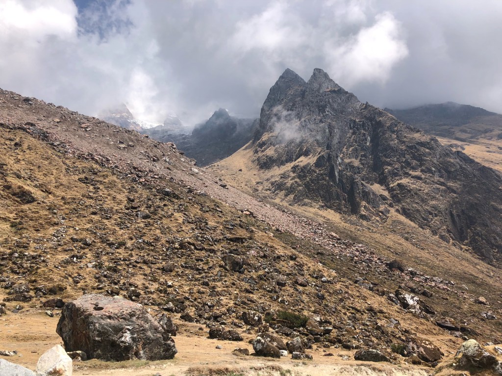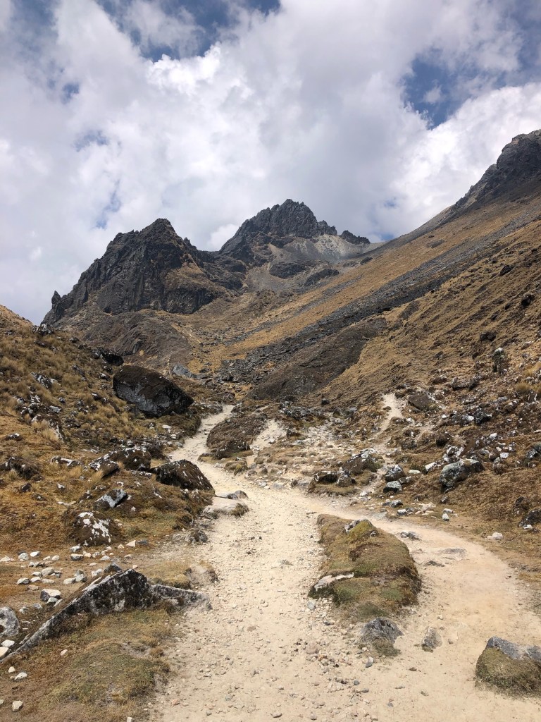 À l’approche du col, le sentier, barré par une imposante colline de pierre, oblique à l’ouest. Nous débouchons ainsi sur un magnifique petit plateau brun, posé entre les monts Humantay et Salkantay. Je distingue alors le glacier presque touché lors de mon escapade avec Colin la veille. Nous prenons la pose devant un minuscule lac, puis entamons l’ultime ascension vers le Salkantay pass, à 4600m d’altitude.