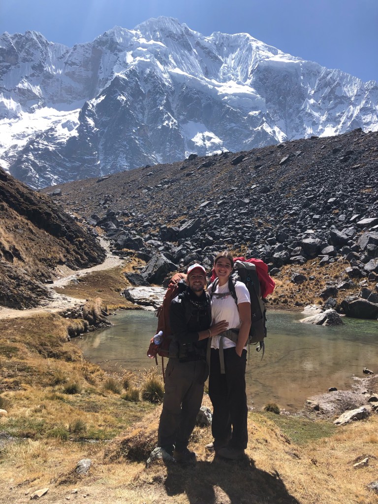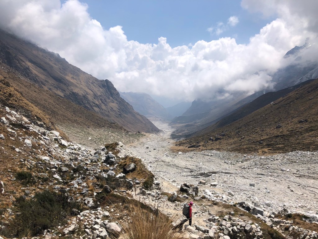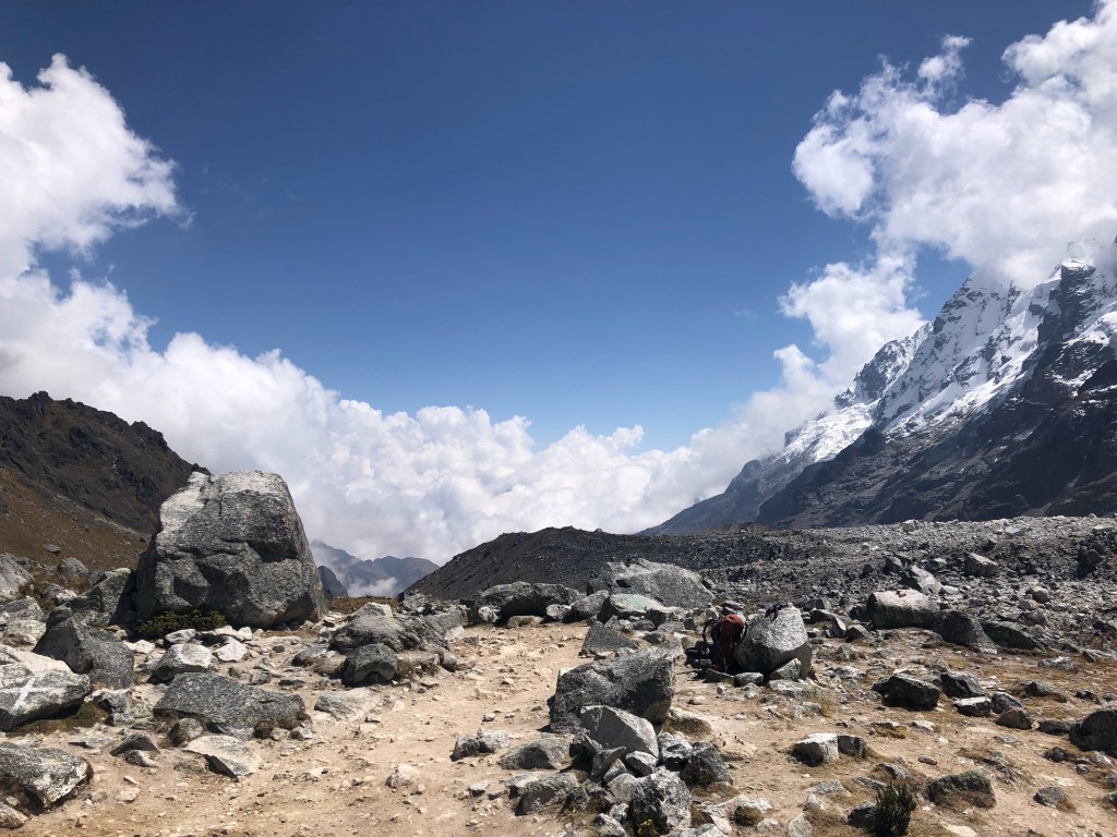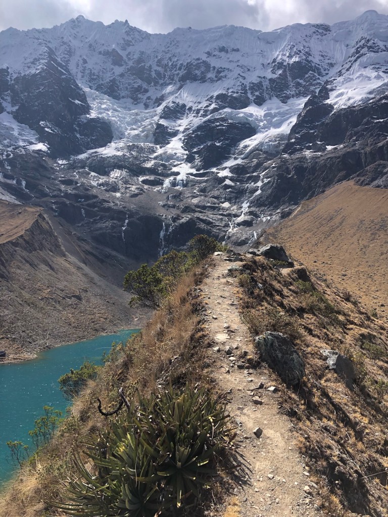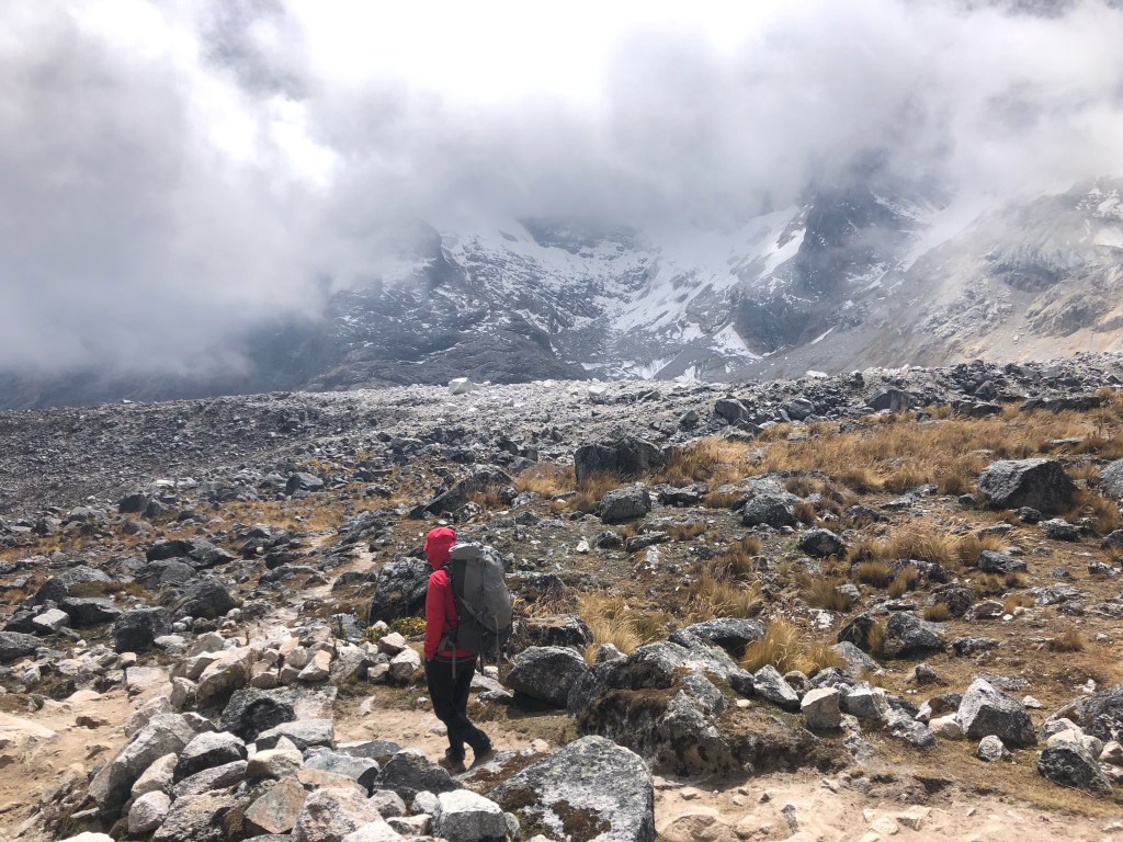 À l’approche du col, le sentier, barré par une imposante colline de pierre, oblique à l’ouest. Nous débouchons ainsi sur un magnifique petit plateau brun, posé entre les monts Humantay et Salkantay. Je distingue alors le glacier presque touché lors de mon escapade avec Colin la veille. Nous prenons la pose devant un minuscule lac, puis entamons l’ultime ascension vers le Salkantay pass, à 4600m d’altitude.