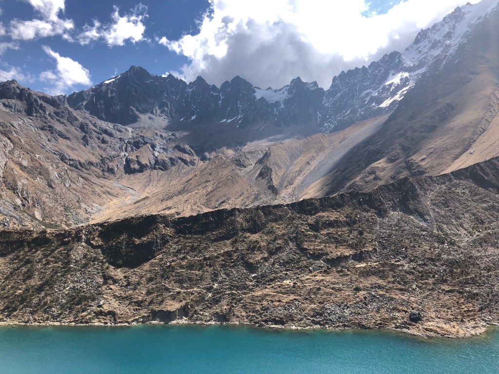 Parvenus au bout, après avoir touché du doigt les parois du si haut Humantay, fatigués de cette ascension en altitude, nous nous reposons contre une grosse pierre, en admirant le paysage. De notre perchoir, on aperçoit Soraypampa, et la vallée brune qui descend jusque Mollepata. Le lac est tout petit vue d’ici, et je peine à distinguer Arlette sur la berge. De l’autre côté de l’arrête opposée, les contreforts sombres du mont abritent une paire de torrents et un périlleux petit glacier.