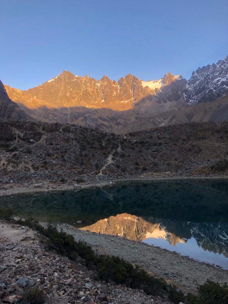Vendredi matin, lagune Humantay. Il est 6h. Les oies troublent une dernière fois le reflet des montagnes dans le miroir du lac, puis s’échappent vers d’autres cieux avant l’arrivée des premiers touristes. Émerveillés, nous regardons le soleil coloniser petit à petit le mont Humantay. Et réchauffer par la même occasion nos doigts engourdis.