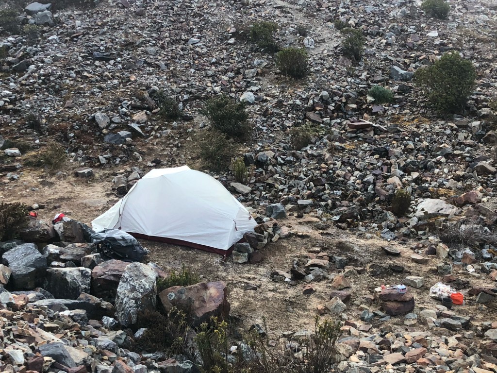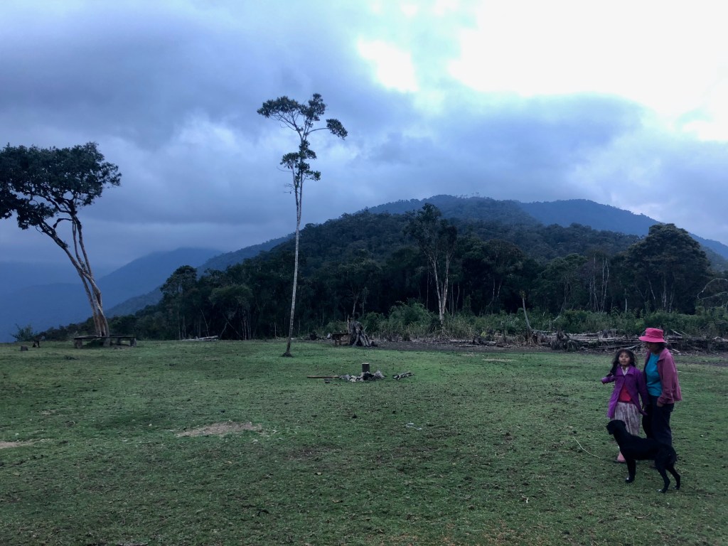 Sur le petit plateau qui marque le point culminant de notre montagne, nous trouvons une petite cabane, ainsi qu’une femme au chapeau traditionnel et sa petite fille, qui semble ravie d’avoir un peu d’animation. Très peu de touristes par les temps qui courent, et la grande majorité des randonneurs ayant bravé la pandémie passent par Santa Teresa, dans la vallée. Mère et fille nous offrent deux Cusqueñas tièdes, que nous savourons assis devant ce merveilleux paysage. Notre première idée était de planter la tente ici, mais les nuages denses et noirs nous font hésiter. Et la charmante dame au chapeau confirme nos craintes : les nuits sont pluvieuses depuis une semaine. Nous prenons ainsi congé du souriant duo, et descendons vers le Llactapacta lodge afin d’y faire halte pour la nuit, à l’abri.