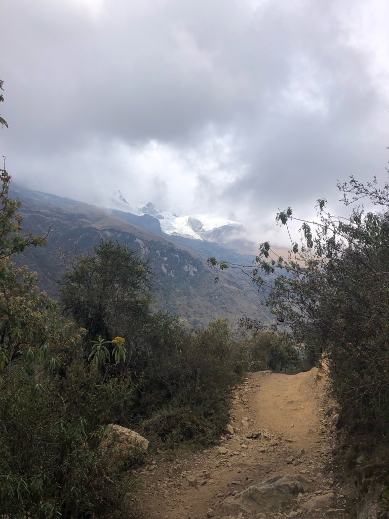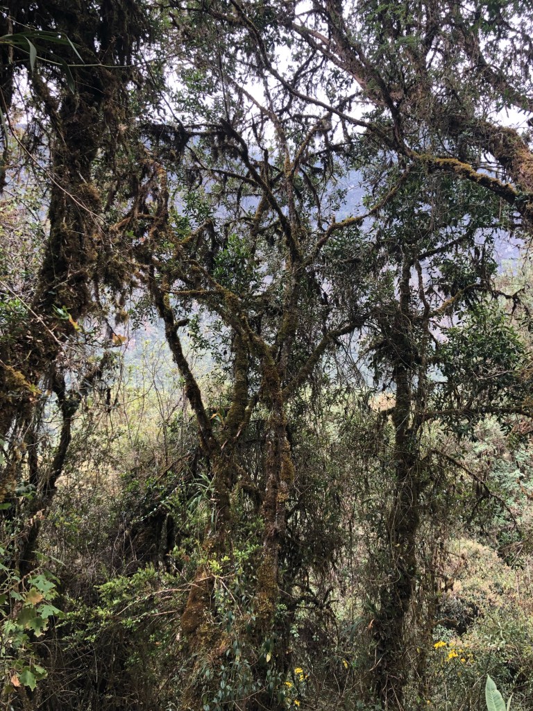 Passé le hameau, le paysage change subitement. Le flanc des montagnes se couvre de vert, les colibris butinent des fleurs de plus en plus nombreuses, et moustiques et taons sortent du néant pour nous dévorer les mollets. Nous voici dans la jungle ! En nous retournant, on aperçoit encore les sommets enneigés, alors que dans le ravin la mousse recouvre les arbres. Hallucinant !
