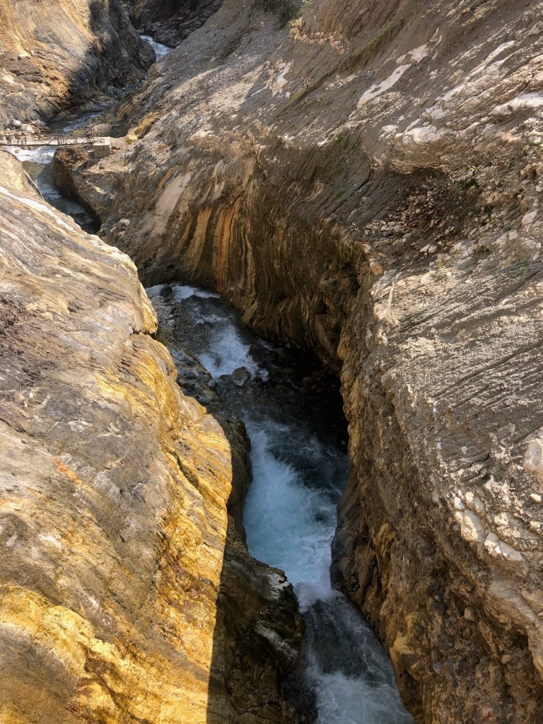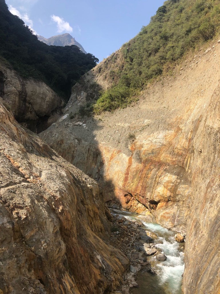 Le sentier ayant été dégradé par une série d’éboulements, nous progressons sur une étroite route de terre, néanmoins très peu fréquentée. La route descend sur quelques kilomètres, jusqu’à la traversée d’une vive rivière creusant de somptueuses gorges dans la roche aux reflets ocres.