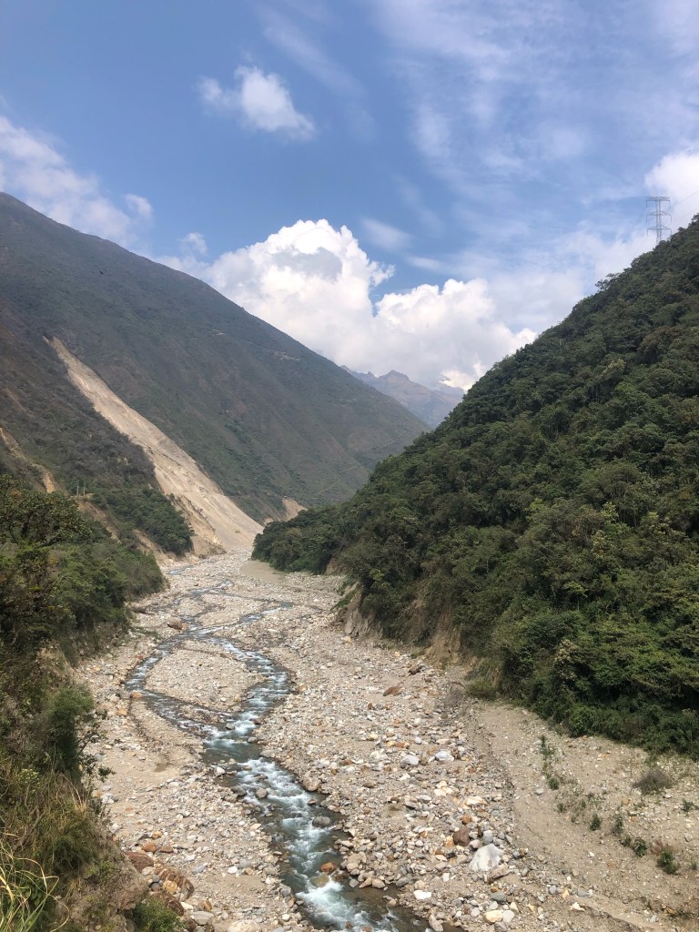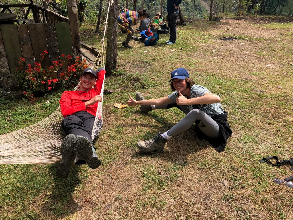 Puis le chemin monte en pente douce, le long du rio, sous les cris stridents des mitred parakeets. A l’approche du village de Sahuayaco, nous croisons Pierre et Carlota, allongés dans l’herbe. Pierre plaisante à nouveau sur le rythme de sénateur du groupe, et je partage quelques tuyaux sur les Galápagos, leur prochaine destination. Nos chemins se séparent ici, puisque leur groupe se dirigera vers Santa Teresa, avant de rejoindre Aguas Calientes, au pied du Machu Picchu, dès ce soir.