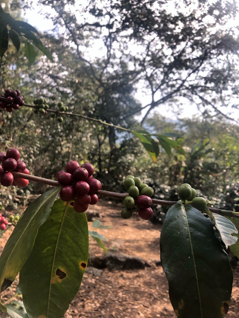 L’itinéraire quitte la route de terre, et nous empruntons un superbe sentier qui grimpe entre plans de café et arbres fruitiers. Au détour d’un lacet, un délicieux fumet détourne notre attention du paysage : Une famille déjeune tranquillement, ses membres entassés dans une petite cuisine. Nous demandons s’ils servent l’almuerzo, et la charmante tenancière nous installe à l’étage, sur une jolie terrasse dominant la vallée et les plans de café. Après ces longues heures de marche, la halte est délicieuse, et le déjeuner savoureux. Et sacrément copieux ! Le café fraîchement moulu est un régal, et, avant de partir, nous en achetons un paquet à la sympathique patronne.