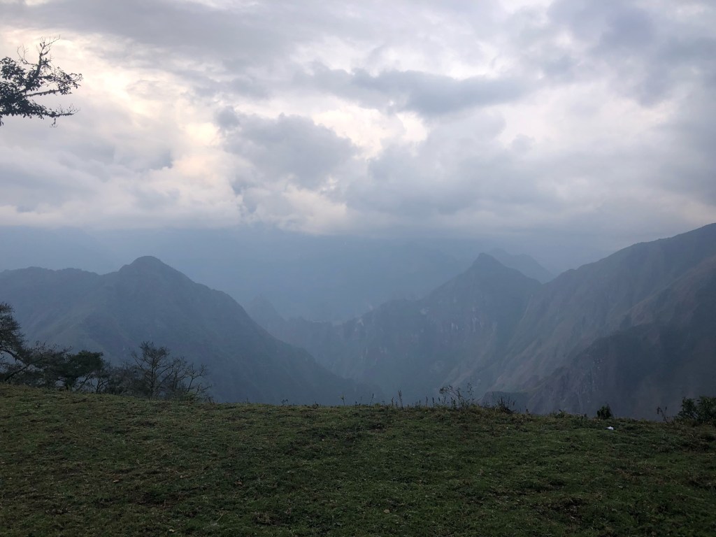 En pleine digestion, la montée jusqu’aux cimes est rude…Les quelques 800m de dénivelé viennent à bout de nos dernières forces, mais l’arrivée au sommet récompense allègrement nos efforts. Il fait déjà sombre en cette fin d’après-midi, et le ciel est menaçant, mais nous distinguons toutefois sans peine le Machu Picchu, perché sur une arrête de l’autre côté de la vallée ! Je reconnais le Hayna Picchu, le mont qui domine la mythique cité inca, que j’avais gravi lors de mon premier passage ici.