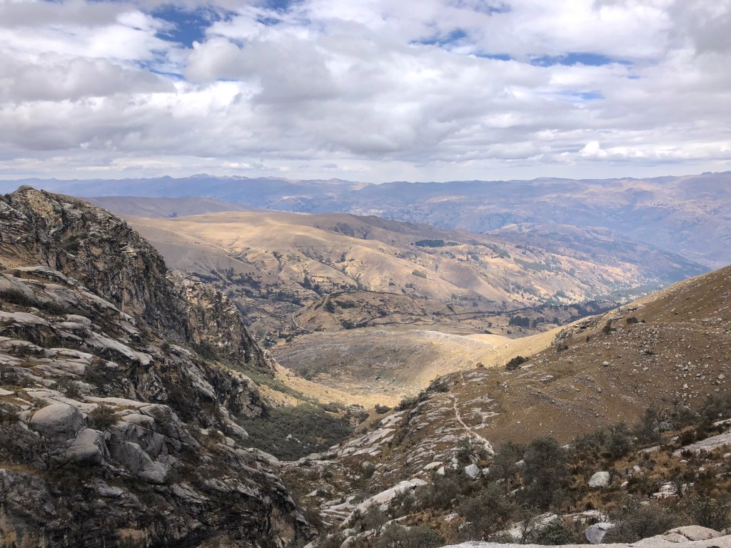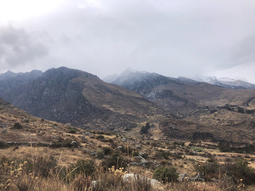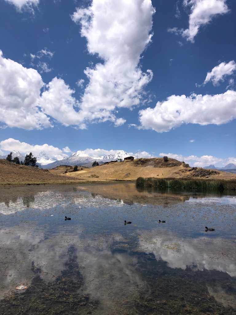 Un collectivo nous dépose ainsi en quinze minutes au pied d’une colline dorée. Une heure de marche en pente douce nous mène à un tout petit lac où se reflètent les quelques nuages qui décorent un ciel superbe. Ibis vertes, american coots et autres canards y pataugent paisiblement. Autour de l’étang, à la beauté si simple, quelques familles de locaux se reposent au soleil, en contemplant la spectaculaire vue sur les cordillères blanche, noire, et Huayhuash. Partout, des monts enneigées se détachent de l’horizon en dents de scie: la région compte plus de 50 sommets à plus de 5000m…Cet incroyable panorama stimule encore d’avantage notre envie d’en découdre avec les pentes escarpées du circuit Huayhuash !