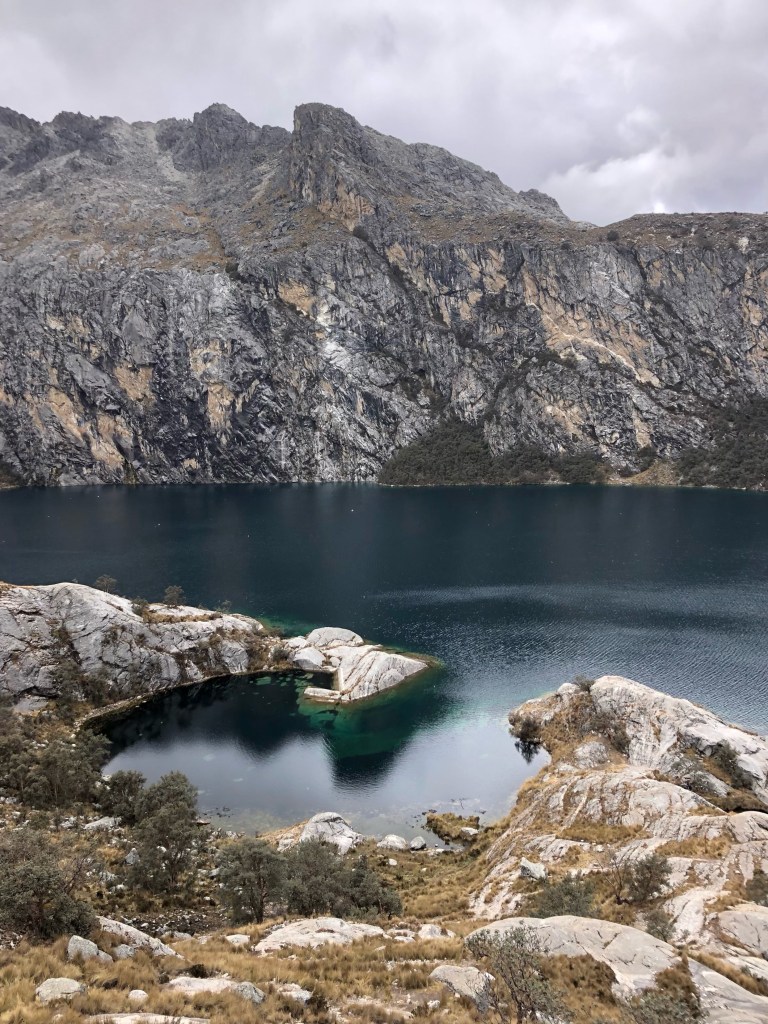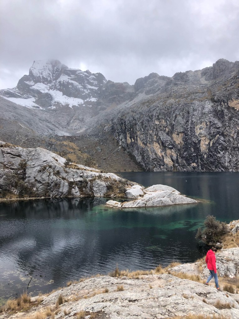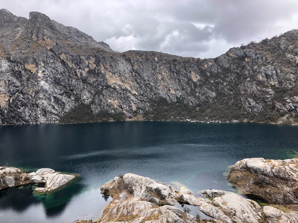 Lundi matin, Huaraz. Il est 7h, et nous attendons que le collectivo pour Pitec démarre, en conversant avec le chauffeur et son père, tous deux experts ès cordillères. Nous atteignons Pitec une heure et demie plus tard, et nous engageons sur le sentier menant à la Laguna Churup, sous un ciel maussade. Le lac est situé à 4500m d’altitude, et la randonnée représente une belle occasion de tester notre acclimatation. Nous gravissons sans peine les quelques 800m de dénivelé jusqu’à un promontoire dominant une jolie flaque d’encre presque noire. Certes la grisaille ambiante n’offre pas le paysage de carte postale vendu par les tours operators en ville, mais les contrastes de textures constituent un joli spectacle.
