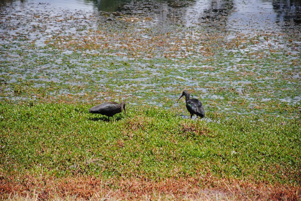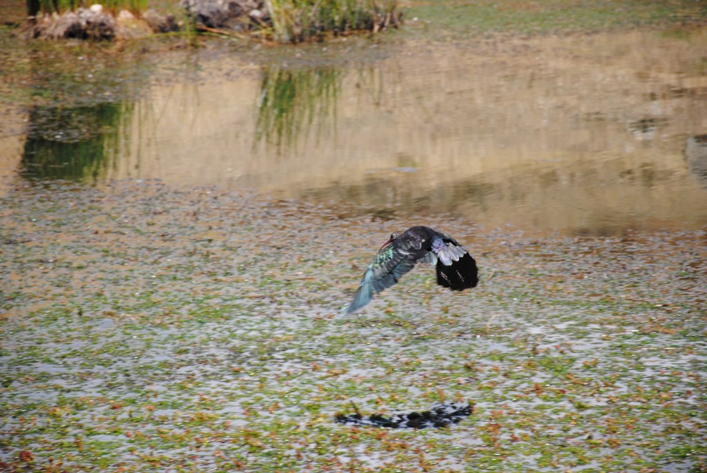 Je tourne autour du lac, recherchant désespérément un couple d’ibis vertes aperçu à notre arrivée. Je m’apprête à renoncer lorsque je les vois, enfin, tout prêt du point de départ de ma virée aviaire. J’aime voire le vert de leurs ailes scintiller au soleil.