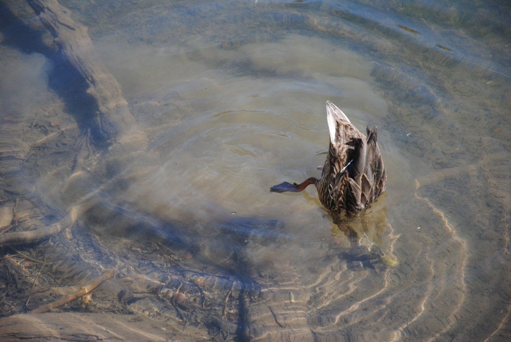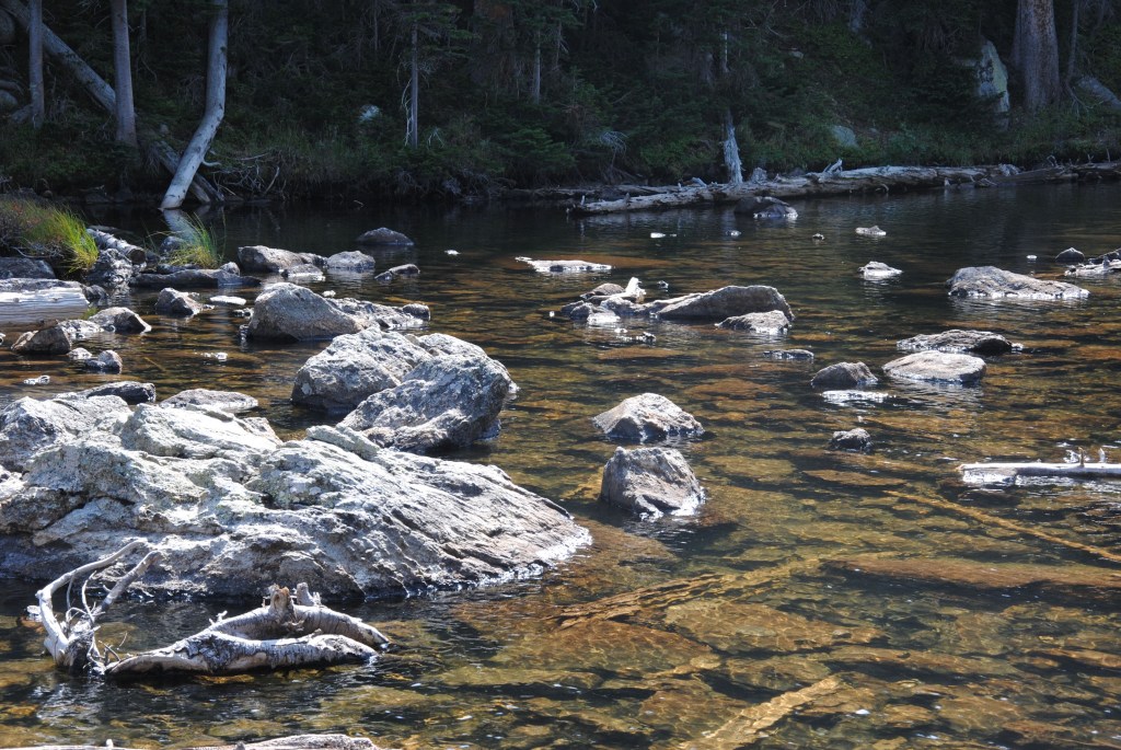 L’astre est déjà caché derrière le roc lorsque nous atteignons le lac émeraude. Si la lumière manque pour réaliser un cliché correct, l’endroit est néanmoins superbe. Dans l’eau transparente du lac, les truites sondent le fond près du rivage, imitées par les colverts qui se cachent à notre approche.