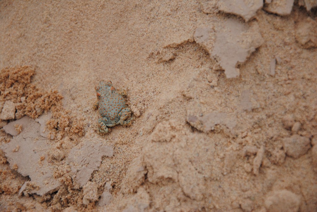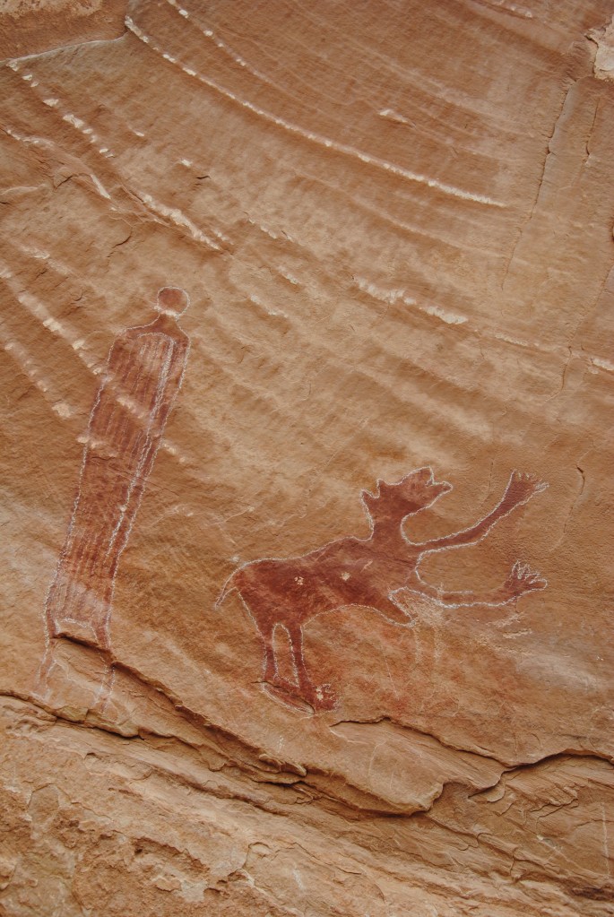 Au détour d’un virage, Arnaud attire notre attention sur des formes rouges peintes à même la paroi. Ces pictographes ont été réalisés par des peuplades ayant habité ces lieux désolés il y quelques millénaires. Je vois dans le plus grand d’entre eux un héron, là où d’autres ont manifestement vu un dragon. Red Heron Canyon, ça aurait fait un joli nom aussi. A ses côtés se tient un fier guerrier Masai, flanqué d’un gros chien qui pourrait aussi bien être une vache. Ces dessins presque enfantins me ramènent à mes explorations en Basse Californie, où déjà ces peintures antiques m’émouvaient.