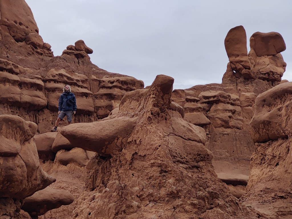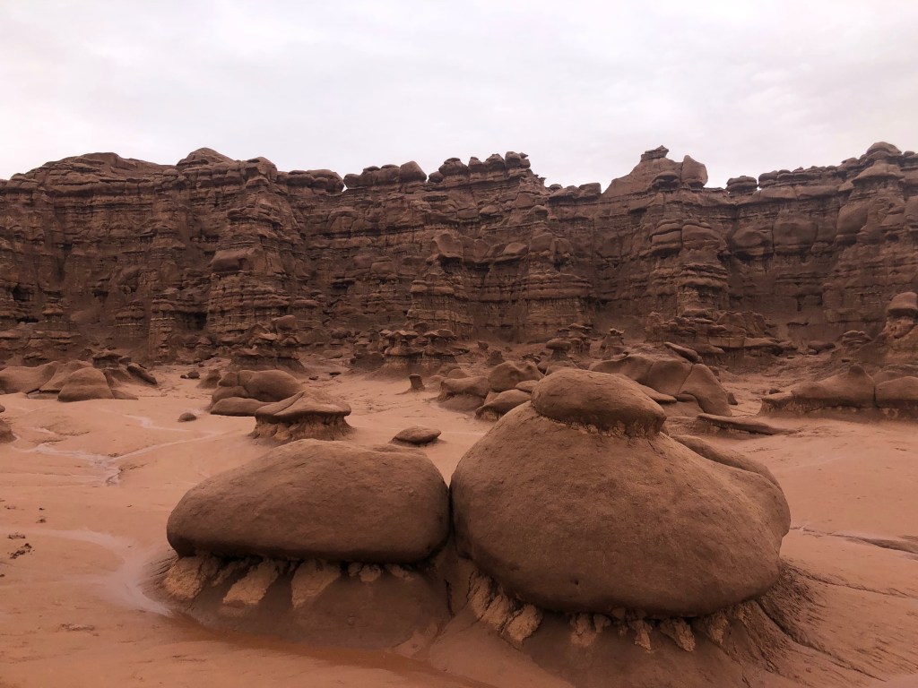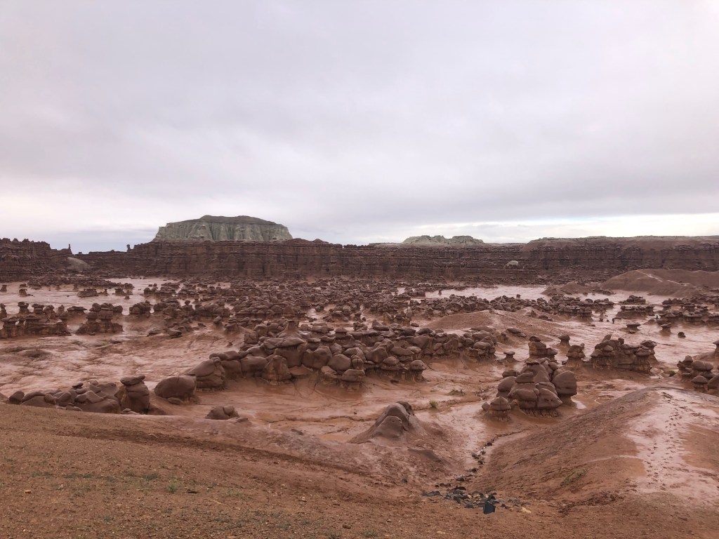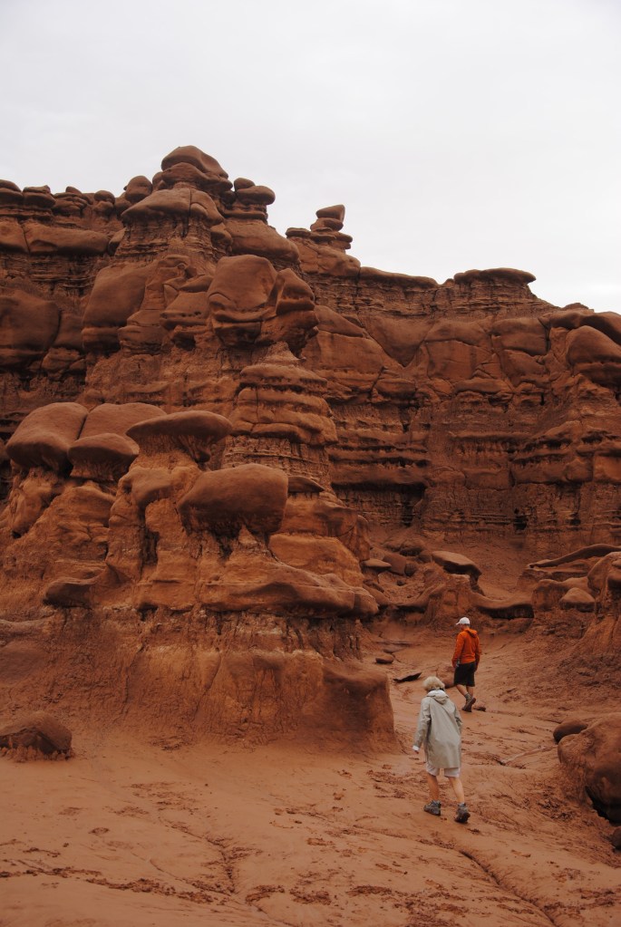 Nous marchons dans ce bizarroïde village de schtroumpfs, en prenant soin d’éviter la chute : la pluie a transformé le désert en champ de boue. Les glissades rendent la balade ludique, nous déambulons, hilares, au milieu des figures irréelles sculptées par le temps. Nous rivalisons d’imagination pour voir ici un Cyrano, là un babouin, ou encore là une soucoupe volante. Le soleil fait une apparition timide alors que nous rejoignions le parking, revêtant le paysage de couleurs hallucinantes. Quel spectacle !