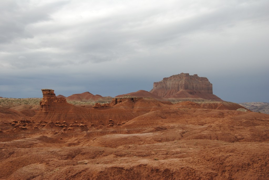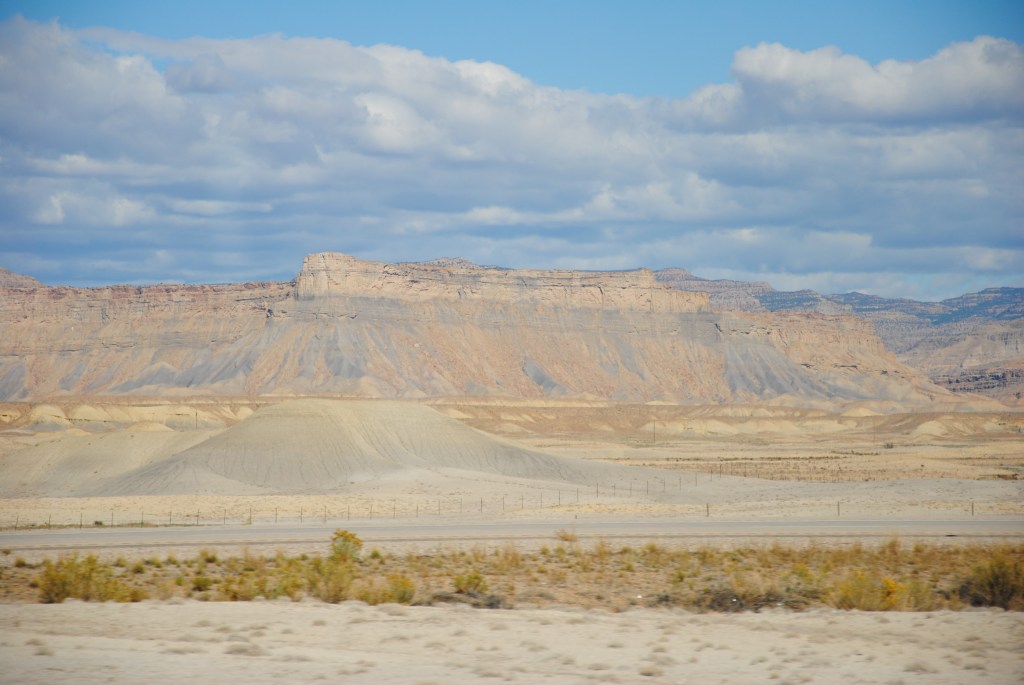 Nous arrivons bien vite au pied du San Rafael Swell, boursouflure longiligne aux parois inclinées vers l’intérieur. On devine de nombreux canyons creusant la roche pour pénétrer les mondes engloutis dans le ventre du swell.